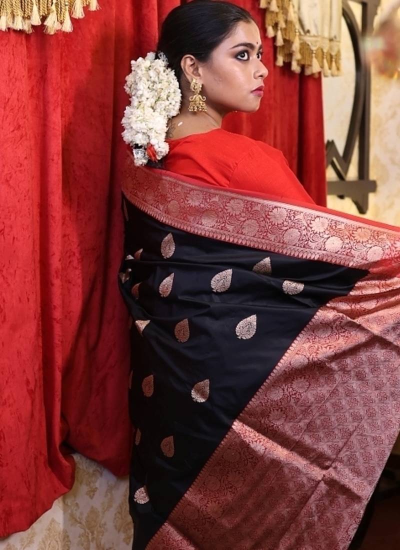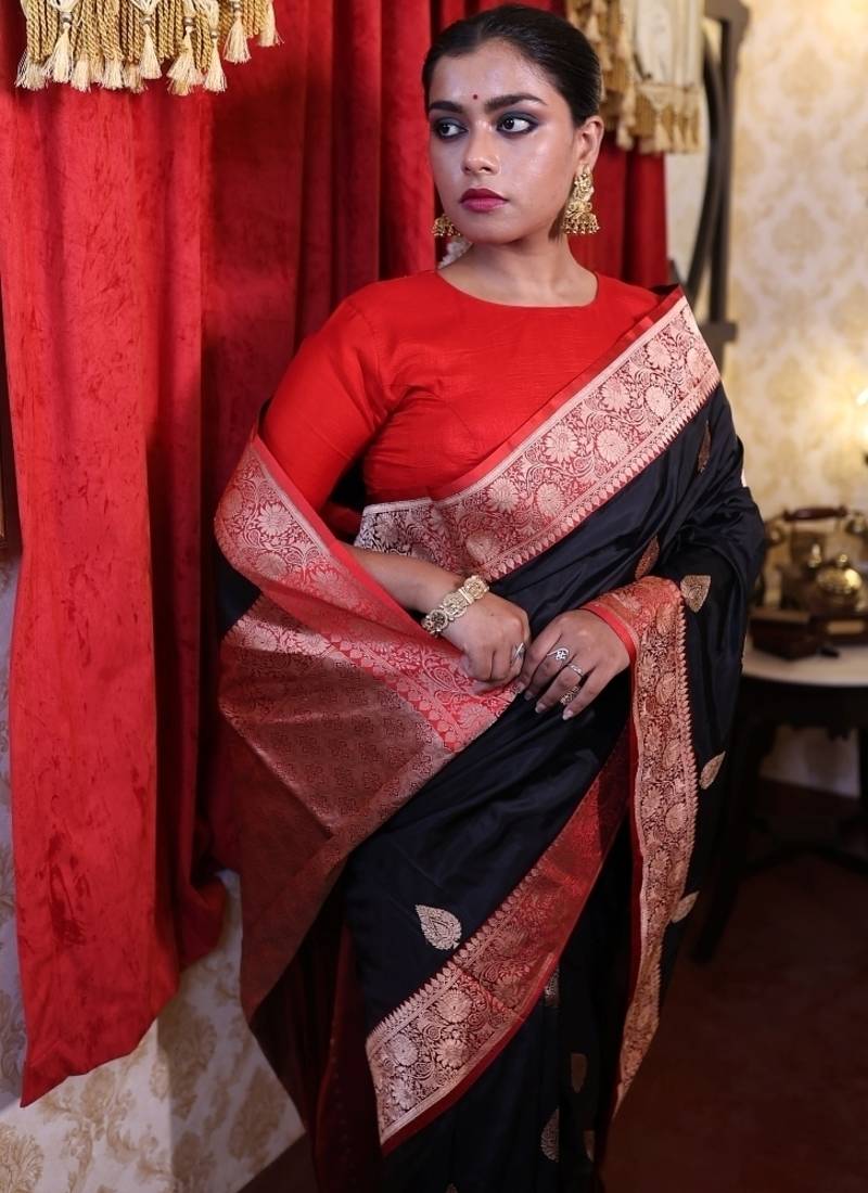 | Product Description | Black Pure Katan Handloom Banarasi Saree Is A Timeless Expression Of Tradition & Elegance. The Deep Black Silk Base Is Richly Adorned With All Over Copper Zari Kadhua Buta, Lending It A Warm, Intricate Shimmer That Catches The Eye Without Overwhelming. A Bold Red Border Frames The Saree, Adding A Vibrant Edge That Enhances Its Regal Appeal.
