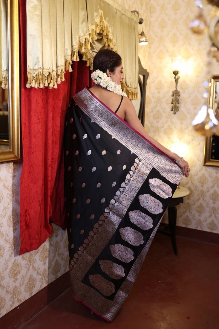 | Product Description | Black Banarasi Mashru Silk Saree Is A Stunning Blend Of Rich Tradition & Contemporary Elegance. The Deep Black Base Is Adorned With All Over Copper Zari Buta, Adding Warmth & Intricate Detailing That Beautifully Contrasts The Sleek Silhouette. A Striking Magenta Border Frames The Saree, Lending A Vibrant Pop Of Color & Modern Flair.