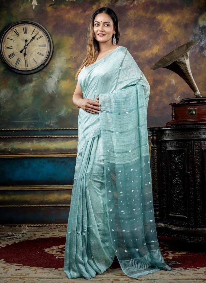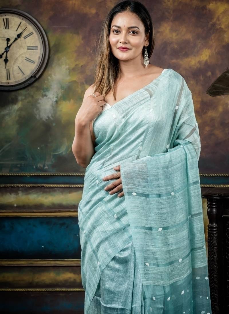 | Product Description | The Ice Blue Matka Bengal Handloom Saree Features A Plain Matka Body That Transitions Into Muslin Block Stripes, Woven With Sea Shell Highlights, & Finishes With A Muslin Pallu Adorned In Sea Shell Accents — A Breezy Fusion Of Craftsmanship & Contemporary Design.