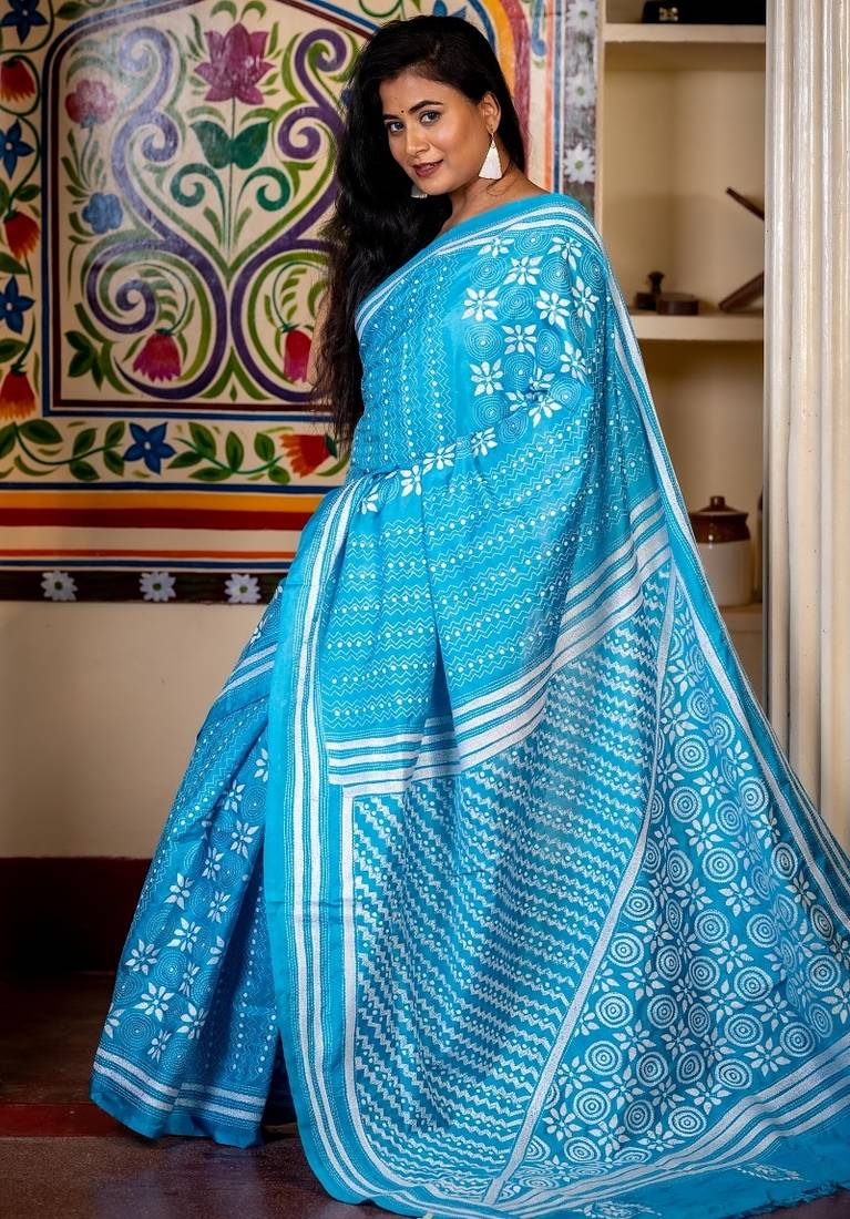 | Product Description | The Turquoise Blue Bangalore Silk Kantha Stitch Embroidery Saree Is Adorned With All Over White Buti, Zigzag Stripes, & Floral Motifs, Meticulously Rendered Through Fine Kantha Stitch—A Technique That Lends Texture & Intricate Storytelling To Every Detail.