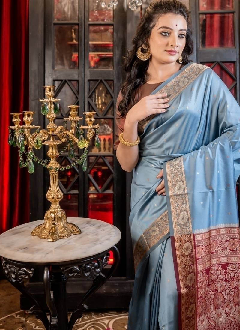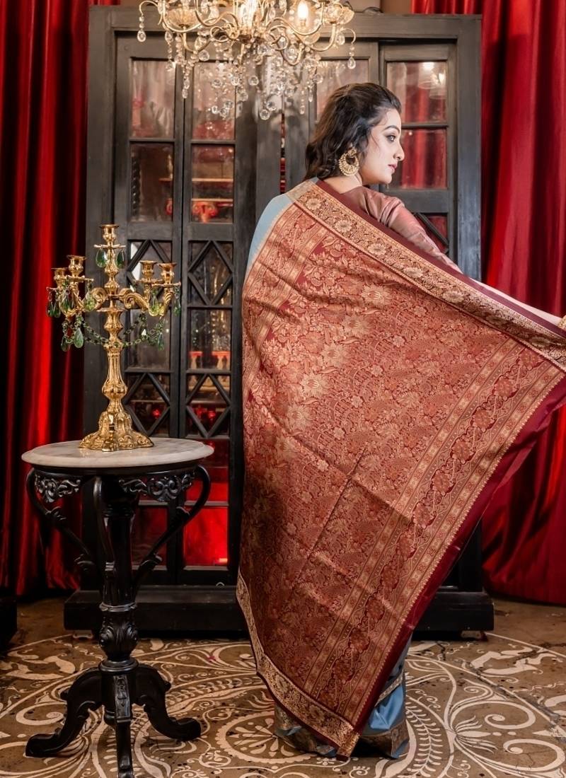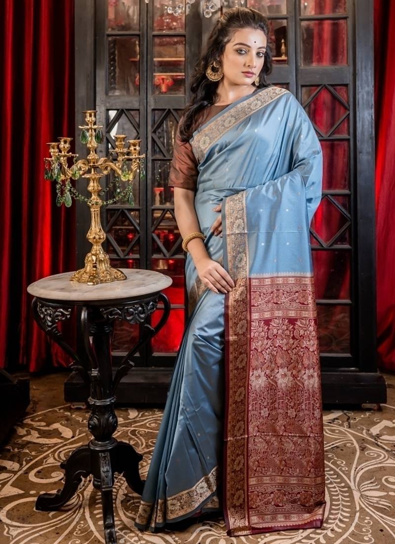 | Product Description | Adorned With All Over Resham Buta In Shades Of Beige & Copper, The Dusty Blue Soft Silk Banarasi Saree Is Thoughtfully Accented By A Light Maroon Border & Pallu, Offering Refined Contrast That Enhances Its Understated Charm.