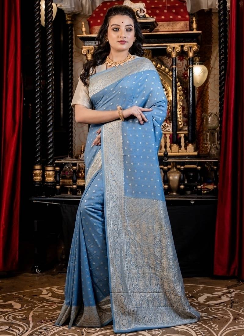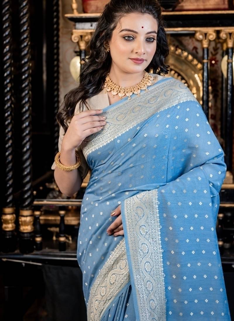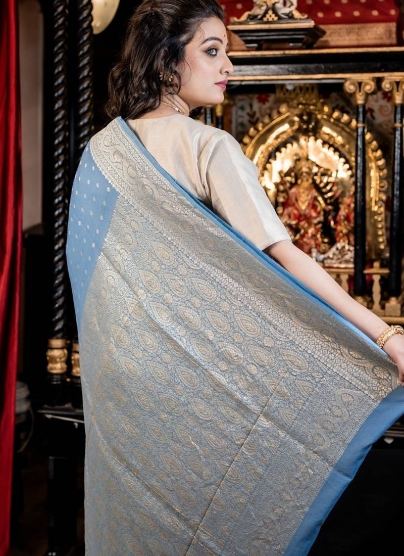 | Product Description | The Dusty Blue Khaddi Munga Banarasi Saree Beautifully Blends Soft Tones With Traditional Craftsmanship. The Base Is Adorned With All Over Buti Woven In Matte Gold Zari, Lending A Quiet Shimmer & Intricate Charm.
