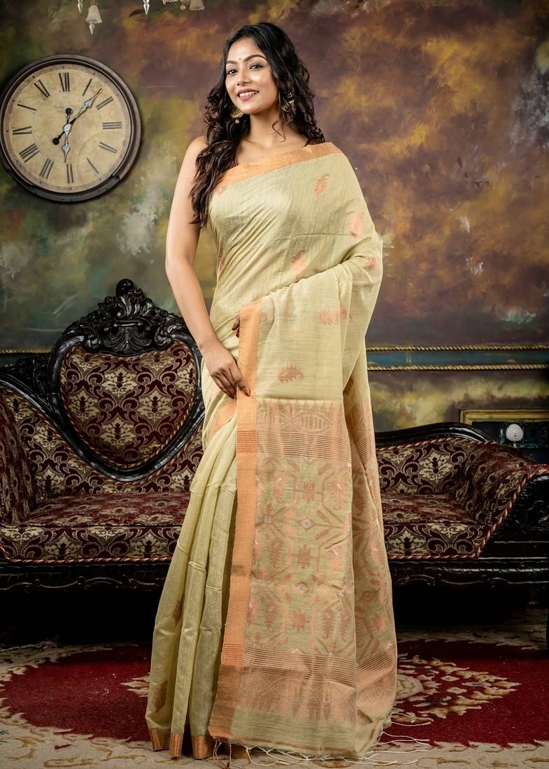 | Product Description | A Graceful Blend Of Subtle Hues & Intricate Craftsmanship, This Saree Irepresents Refined Elegance. The Light Pista Green Matka Bengal Handloom Saree Features All Over Copper Zari Buta, Complemented By A ‘Karat’ Motif Pallu With Silver Zari Highlights, Showcasing Exquisite Handloom Artistry.