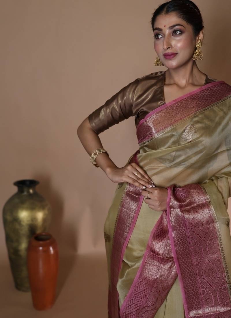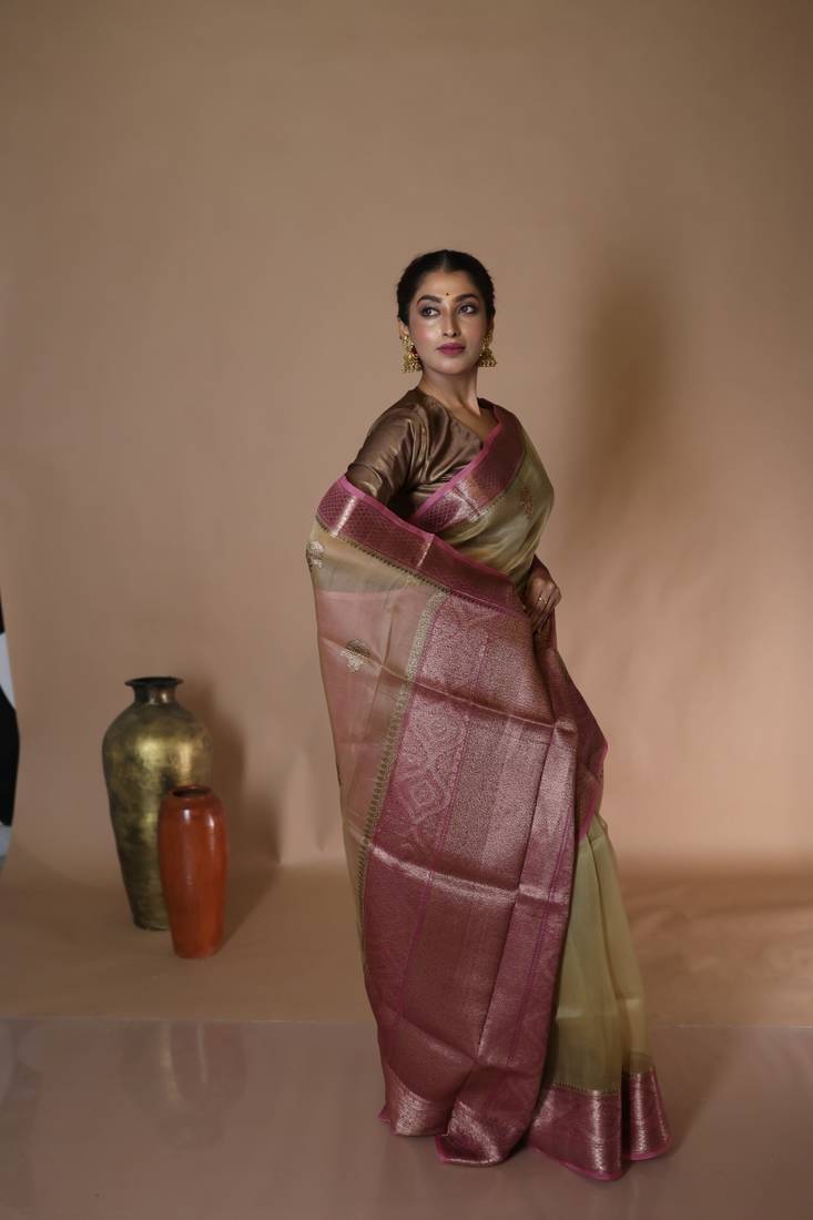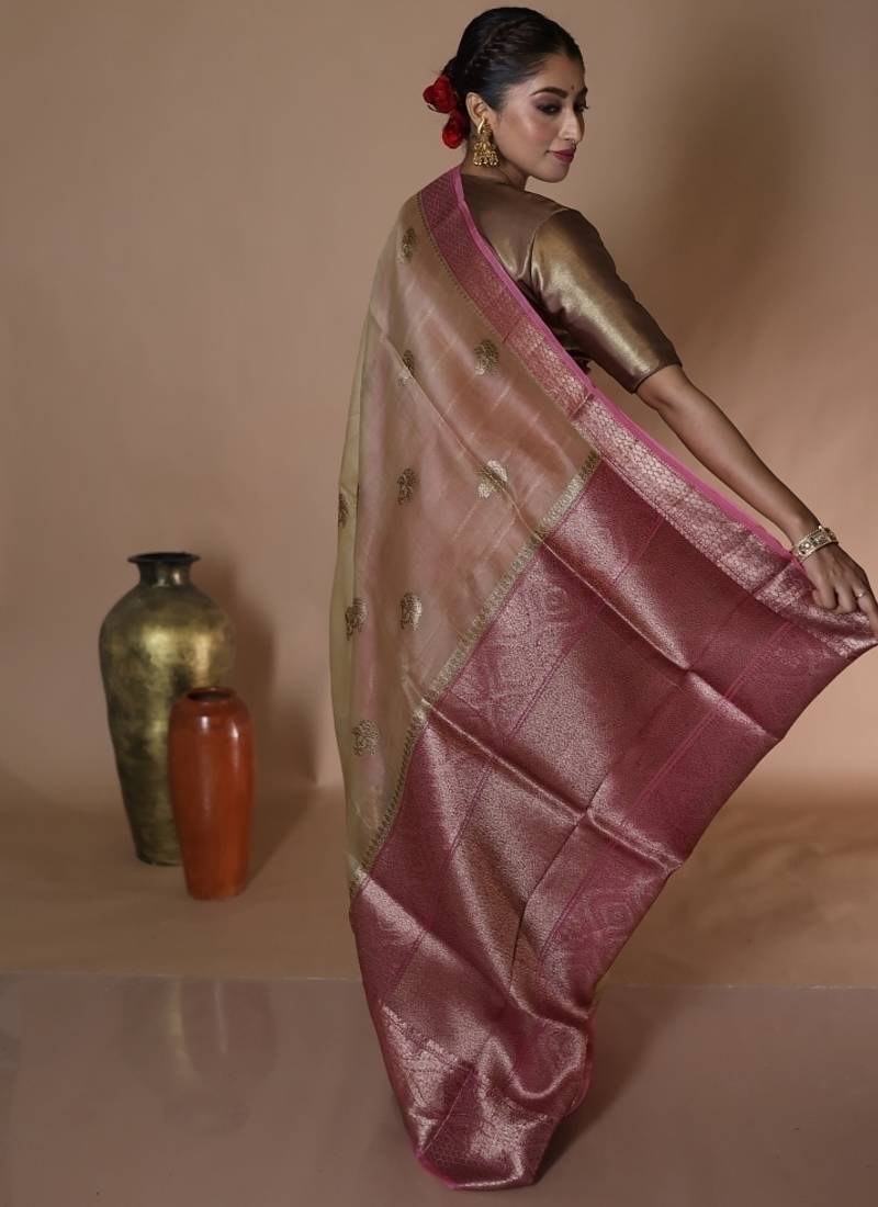 | Product Description | The Golden Khaki Kora Silk Handloom Banarasi Saree Captures Quiet Elegance Of Traditional Weaving. The Base Is Adorned With All Over Antique Zari Kadhua Buta To Create Depth & Texture. A Distinctive Onion Peel Shade Border Lends A Contrast, Enhancing Its Earthy Charm.