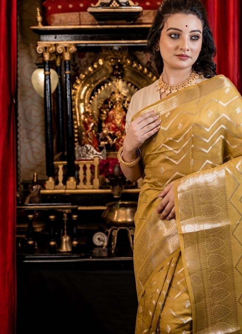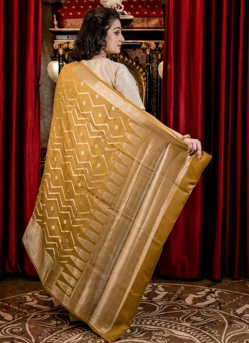 | Product Description | Olive Green Chinia Silk Banarasi Saree Embodies A Harmonious Blend Of Rich Tradition & Subtle Elegance. The Deep Olive Green Fabric Is Adorned With All Over Buta Patterns, While The Silver Zari Zigzag Stripes Across The Pallu Introduce A Contrast To The Design.