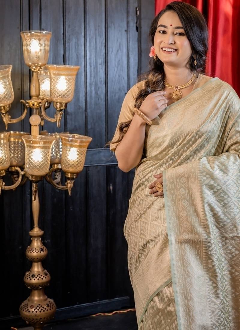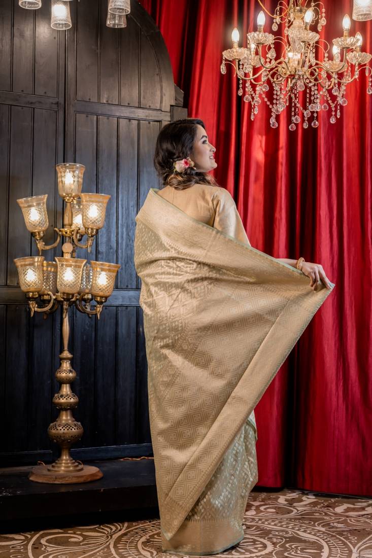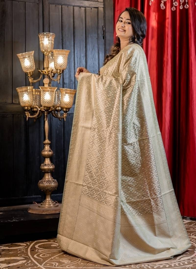 | Product Description | Graceful & Airy, The Mint Green Chanderi Katan Tissue Banarasi Saree Is A Reflection Of Luxury & Artisanal Finesse. The Colour Pairs Harmoniously With The Natural Sheen Of Tissue Silk, Lending A Gentle Luminosity To Every Drape. Its Adorned With All Over Leaf Motif Buta & Delicate Jaal Work, Intricately Woven In Matte Gold Zari, Creating A Textured, Layered Look.
