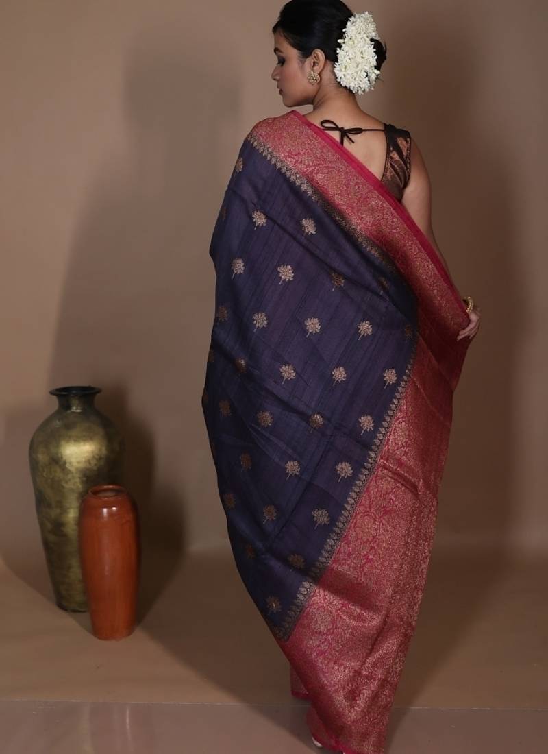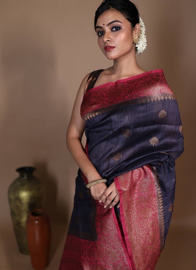 | Product Description | The Gunmetal Grey Pure Tussar Handloom Banarasi Saree Embodies Timeless Elegance With A Modern Edge. Featuring Intricate Kadhiyal Lock Antique Zari Buta Throughout & Striking Beetroot Pink Border, This Saree Weaves Tradition With Contemporary Allure.