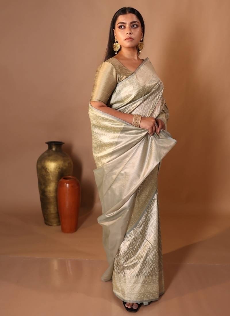 | Product Description | The Metallic Ash Chanderi Katan Tissue Banarasi Saree Is A Modern Woven With Age Old Finesse. The Elegant Metallic Ash Hue Is Beautifully Offset By The Natural Sheen Of Chanderi Tissue, Giving The Saree A Soft, Luminous Finish. Adorned With All Over Leaf Motif & An Intricate Jaal Woven In Matte Gold Zari, It Reflects A Balance Of Tradition, Texture & Understated Grandeur.
