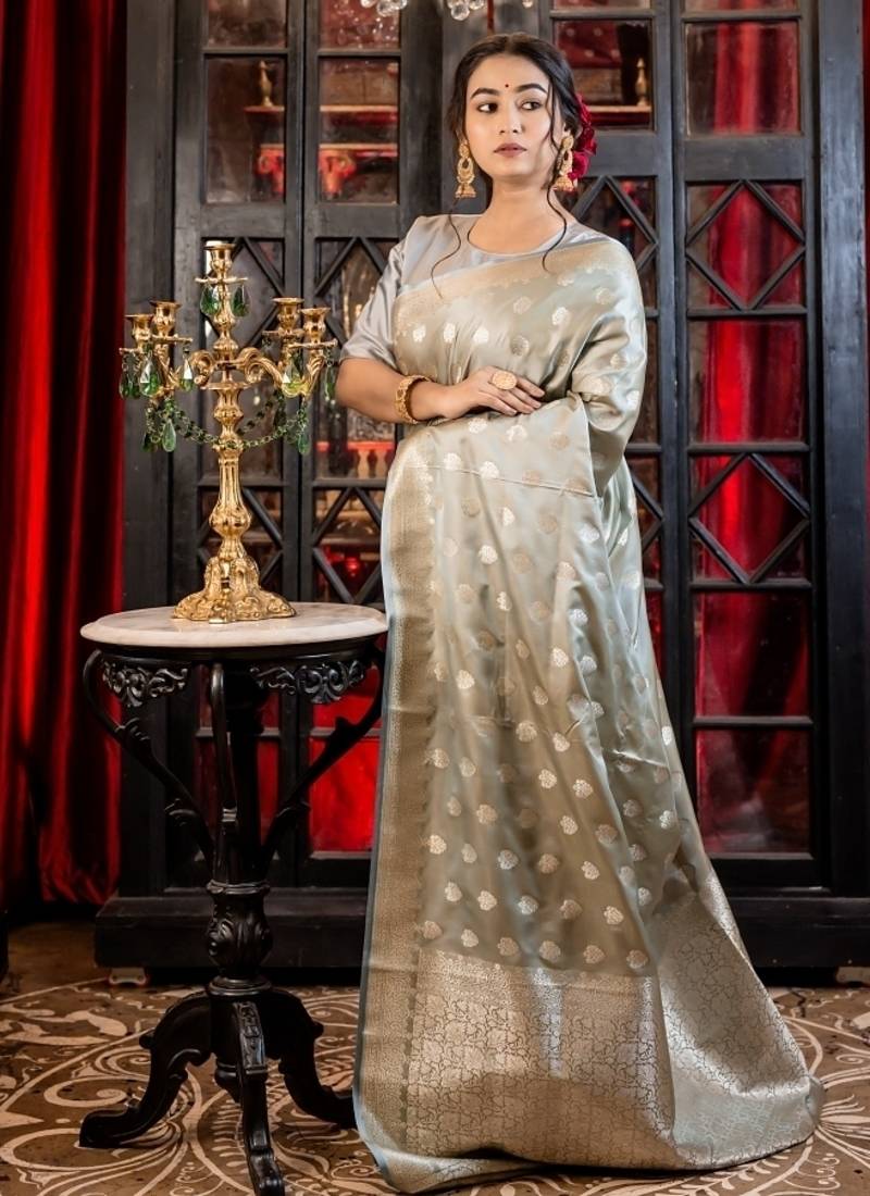 | Product Description | Adorned With All Over Buta Patterns & A Striking Border Woven In Silver Zari, It Captures A Perfect Balance Of Intricate Artistry & Understated Glamour. The Star Of This Ensemble Is The Steel Grey Mashru Silk Banarasi Saree, Whose Cool, Muted Tone Beautifully Complements The Delicate Silver Shimmer.