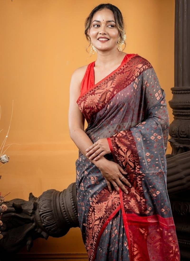| Product Description | The Charcoal Grey Resham Cotton Saree Is Adorned With All Over Red Dhakai Buti & Copper Zari Jamdani Buta, Framed By An Intricately Woven Floral Border & Pallu That Lend Richness & Character To Its Understated Base.