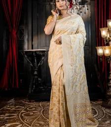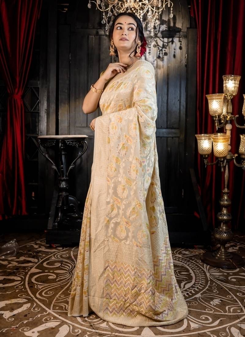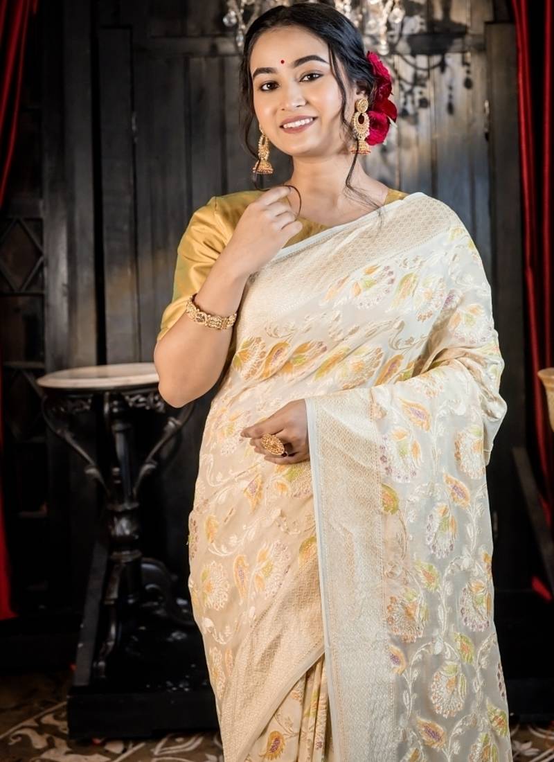 | Product Description | Graceful & Serene, The Ivory Khaddi Georgette Banarasi Saree Exudes Timeless Charm. Featuring Intricate Rifling Handbrush Multi Colour Accents Woven Seamlessly With Matte Gold Zari Floral Motif Jangla, Its A Delicate Balance Of Artistry & Elegance.