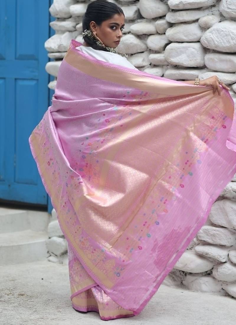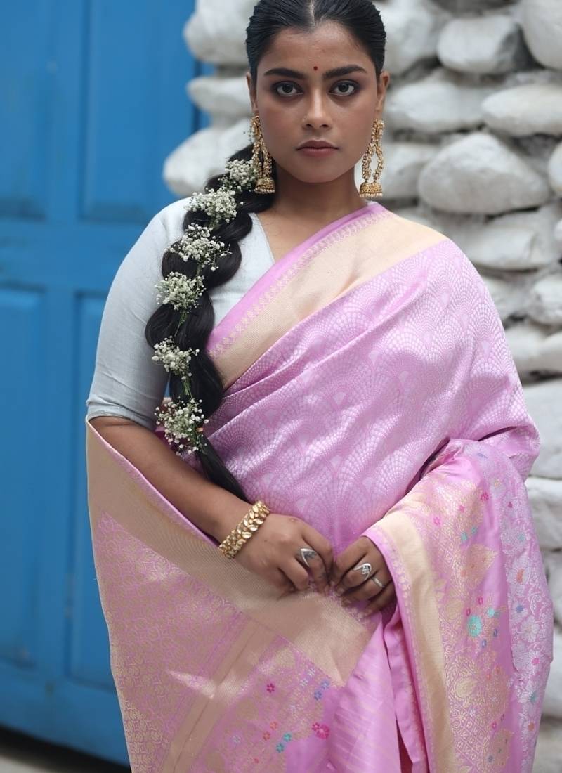 | Product Description | The Mauve Pure Katan Handloom Banarasi Saree Is A Masterpiece Of Refined Artistry. The Silk Base Is Beautifully Adorned With All Over 'sea Shell' Motif Brocade Woven In Matte Silver Zari, Offering A Delicate Shimmer. Complementing It Is A Rich Golden Kadhua Border Highlighted With Intricate Meenakari Work.