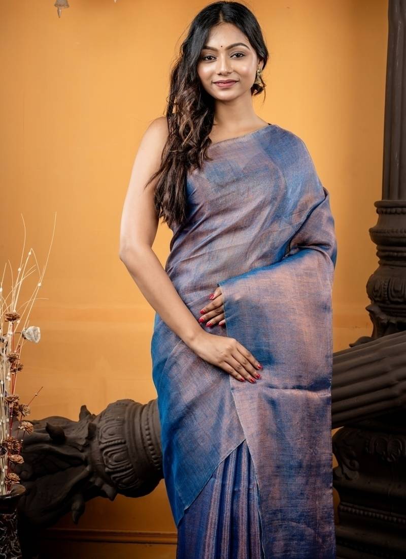 | Product Description | The Dusty Blue &Copper Dual Tone Metallic Tissue Linen Bengal Handloom Saree Features A Metallic Copper Stripe Pallu, Beautifully Complementing The Soft, Luminous Body For A Look That’s Both Contemporary & Timeless.