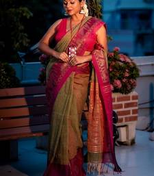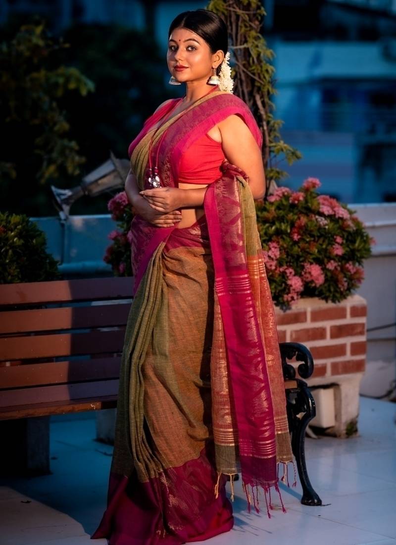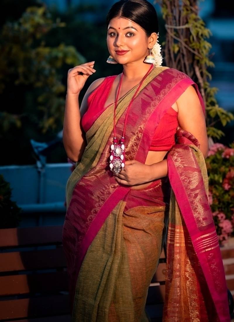 | Product Description | The Olive Green &Mango Yellow Dual Tone Linen Bengal Handloom Saree Features A Plain Body, Elevated By A Magenta ‘Mahapadh’ & Golden Zari Ikkat Border, Paired With A Contrasting Pallu — A Vibrant Take On Classic Handloom Elegance.
