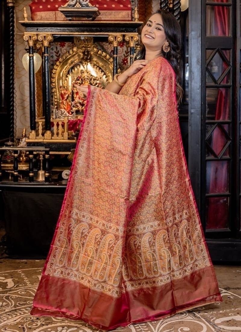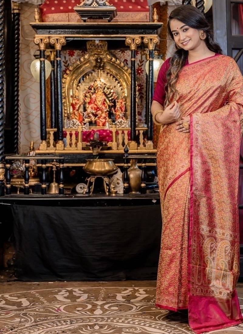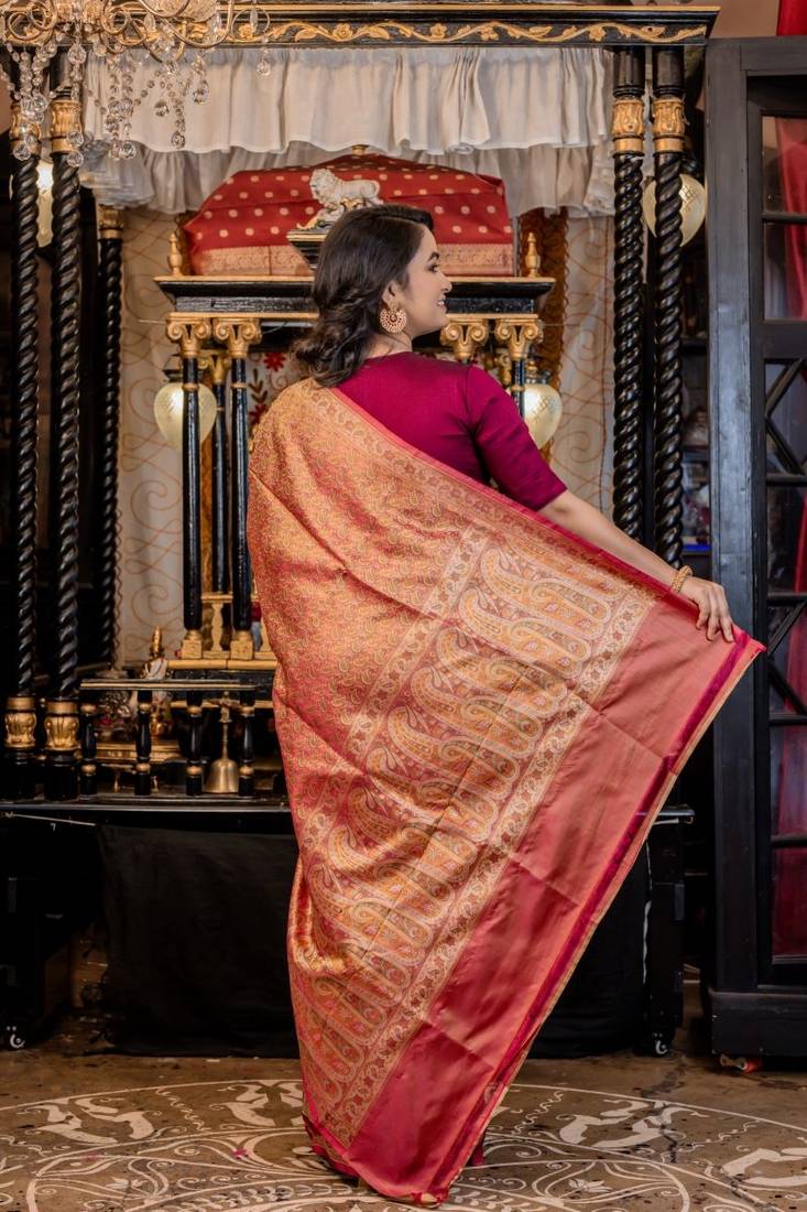 | Product Description | The Beet Red &Olive Green Dual Tone Pure Katan Banarasi Jamawar Saree Is An Ode To Grandeur Of Timeless Weaving Traditions. The Luxurious Dual Tone Base Shifts Gracefully Between Deep Beet Red & Earthy Olive Green, Creating A Rich Canvas For The Traditional Floral Jamawar Design.