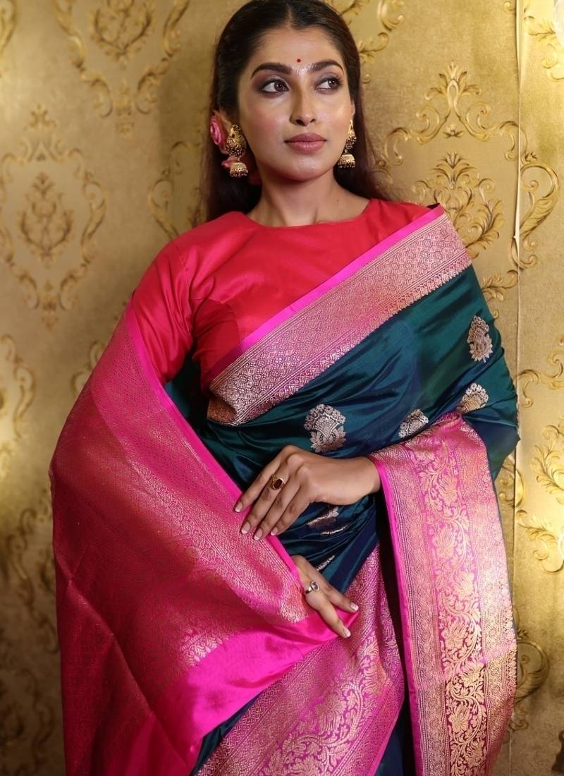 | Product Description | The Bottle Green & Peacock Blue Dual Tone Pure Katan Handloom Banarasi Saree Captures Tradition With A Vibrant, Modern Palette. The Dual Tone Silk Base Seamlessly Blends The Colors, Creating A Mesmerizing Gradient To Enhance The Saree’s Allure. Adorned With All Over Copper Zari Kadhua Buta, The Motifs Add Intricate Detailing, While The Magenta Border Offers A Vivid Contrast.