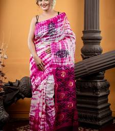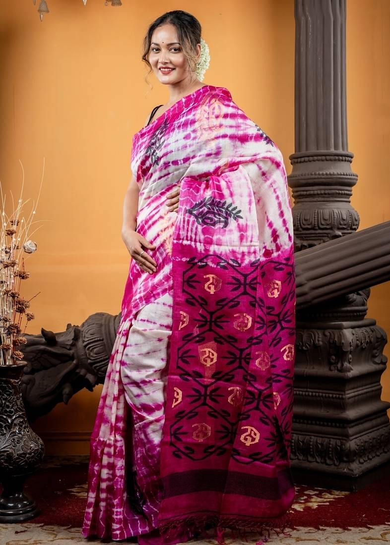 Purple & White Tie & Dye Pure Tussar Saree Is A Striking Representation Of Heritage With Modern Sensibility. It Features A Purple & White Tie & Dye Pattern That Creates A Beautiful Sense Of Movement Across The Body. It Is Framed With A Black & Antique Gold Jamdani Buta Border, Showcasing The Iconic ‘Aam Kalka’ & Floral Motifs, While The Jaal Pallu Brings A Rich, Ornamental Finish.