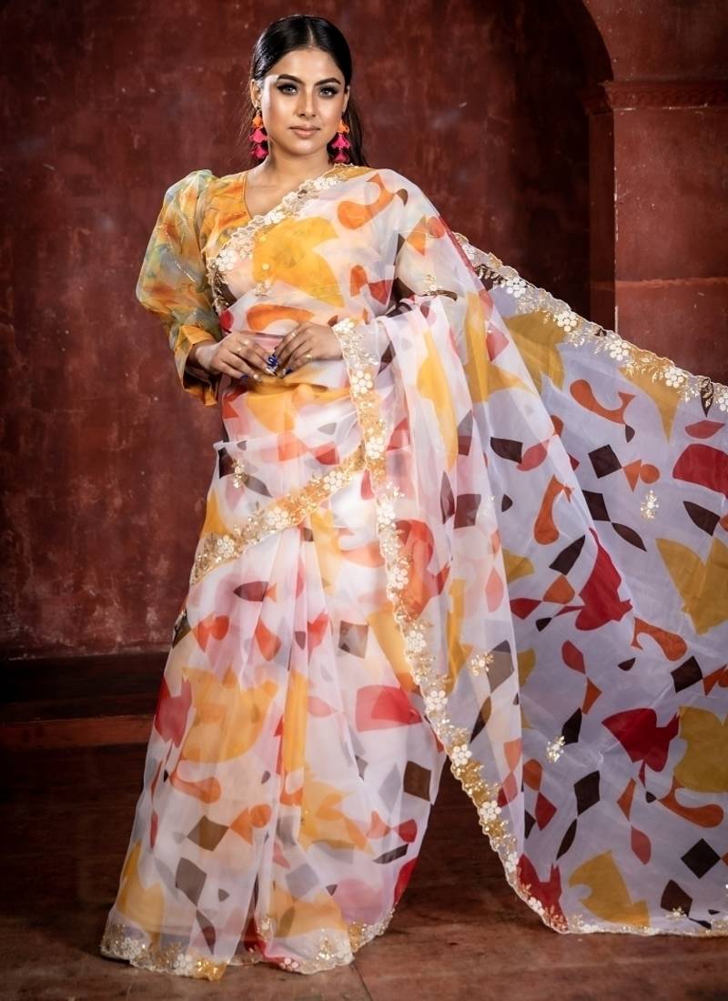Multicolor printed organza resham embroidery all seasons sarees