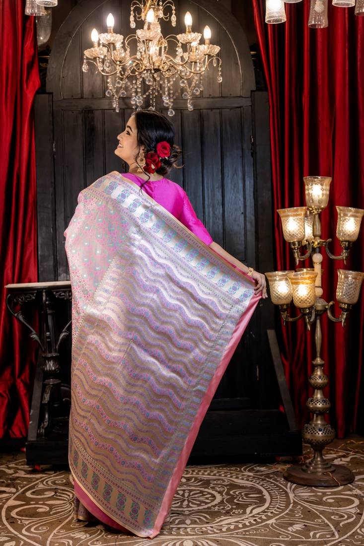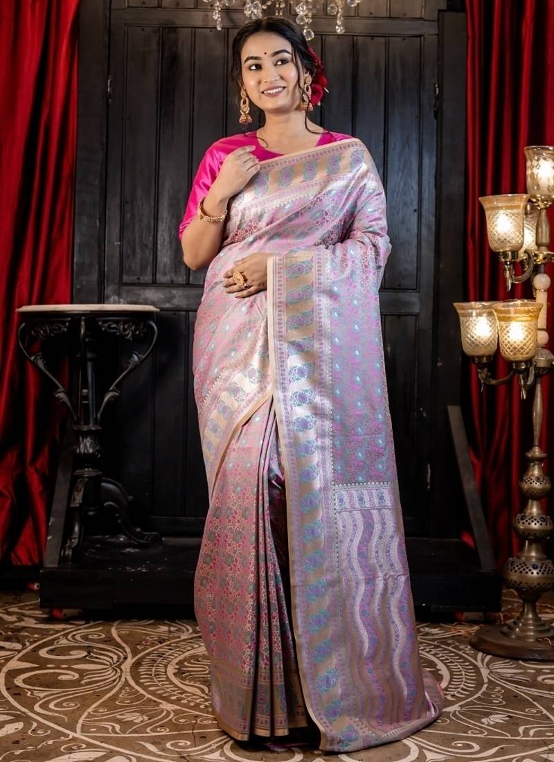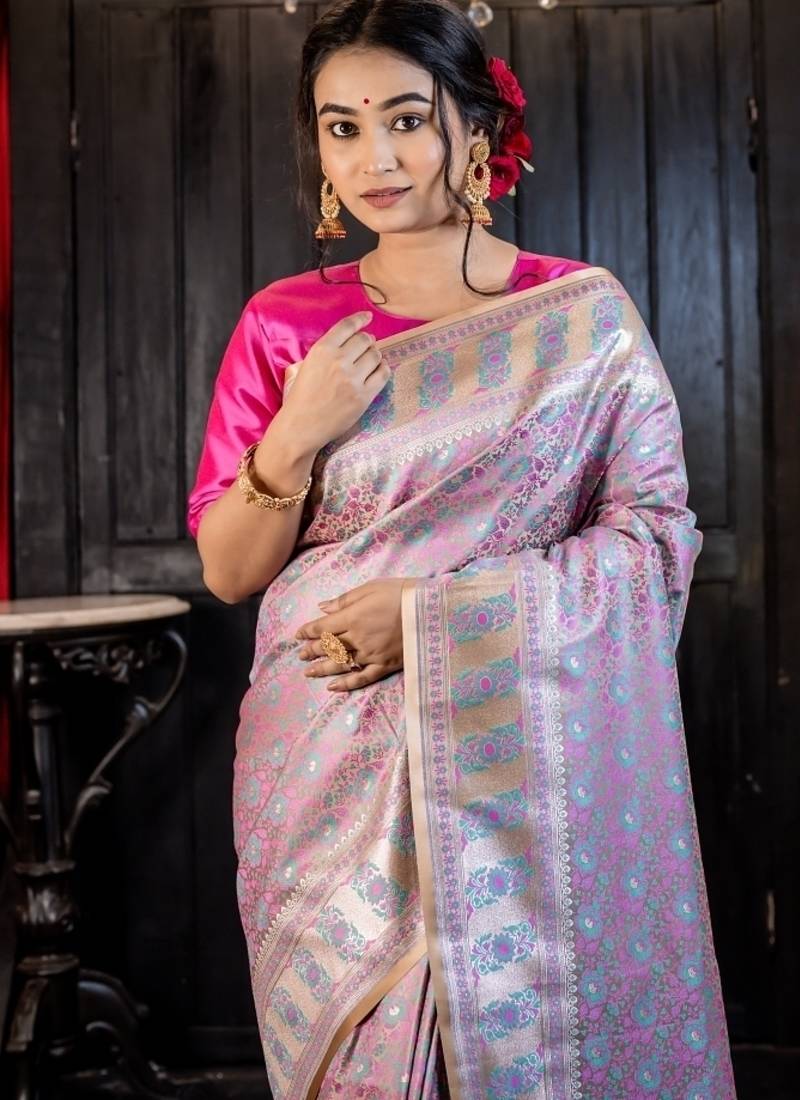 | Product Description | The Mauve &Teal Green Traditional Banarasi Jamawar Saree On A Luxurious Champagne Gold Katan Base Is A Masterpiece . The Delicate Interplay Of Mauve & Teal Green Hues Creates A Rich, Harmonious Contrast, Beautifully Enhanced By All Over Matte Gold Zari Highlights Intricately Woven Into The Buta, Border, & Pallu. The Jamawar Technique Adds Depth & Texture.