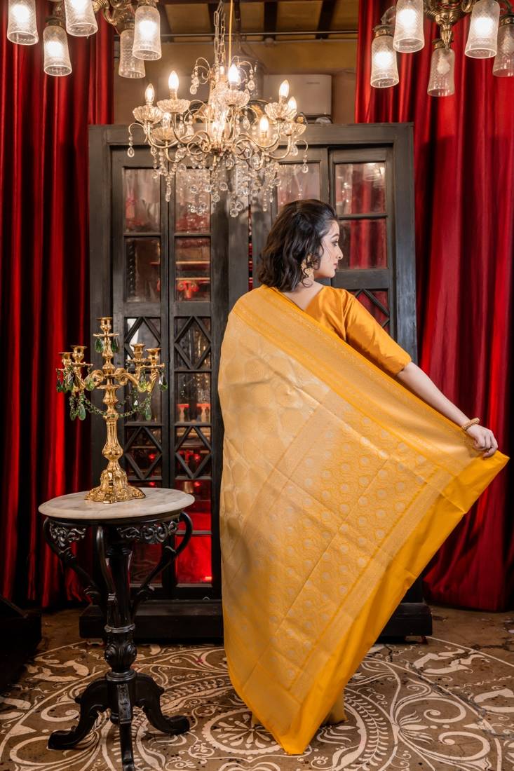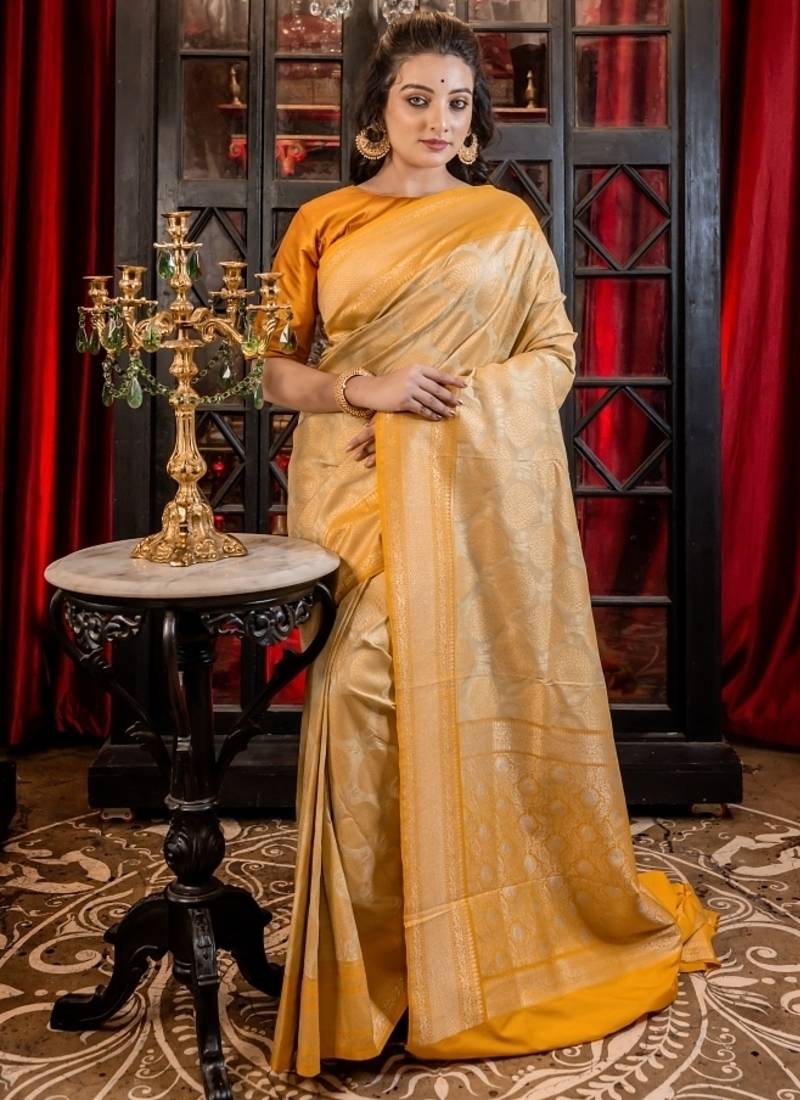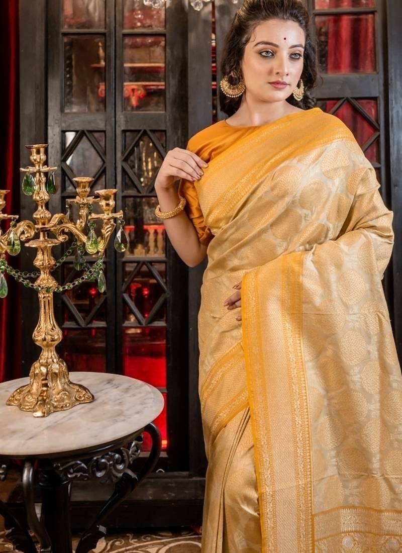 | Product Description | The Beige Base Matka Silk Banarasi Saree . The Soft Beige Silk Body Serves As A Serene Canvas For All Over Tree Motifs Intricately Woven In Matte Gold Zari, Evoking A Subtle Yet Rich Texture Reminiscent Of Nature’s Grace. Adding A Vibrant Pop Of Color, The Mango Yellow Border Frames The Saree Beautifully, Bringing Warmth & Contrast To The Overall Design.