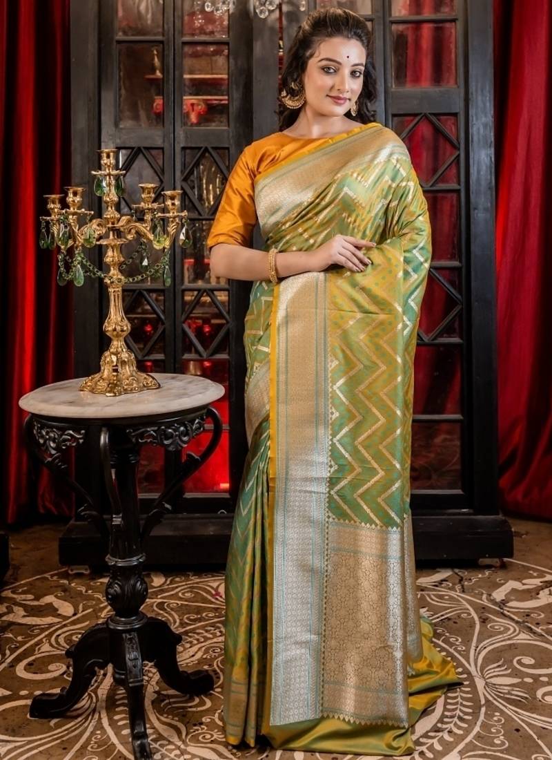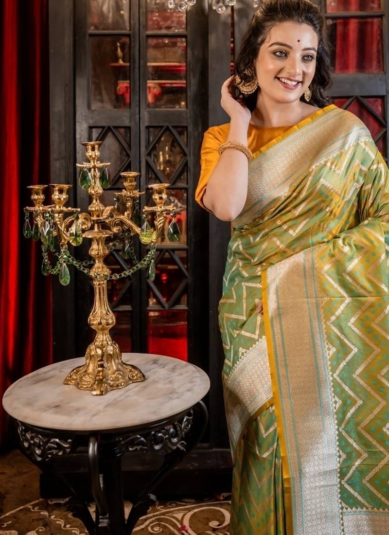 | Product Description | Vibrant & Striking, This Saree Is A Celebration Of Bold Hues & Intricate Detail. Featuring All Over Resham Buta Motifs Interspersed With Silver Zari Zigzag Stripes, The Dual Tone Blend Of Metallic Teal Green & Mustard Yellow Creates A Lively, Dynamic Aesthetic That Captures Both Tradition & Contemporary Flair.