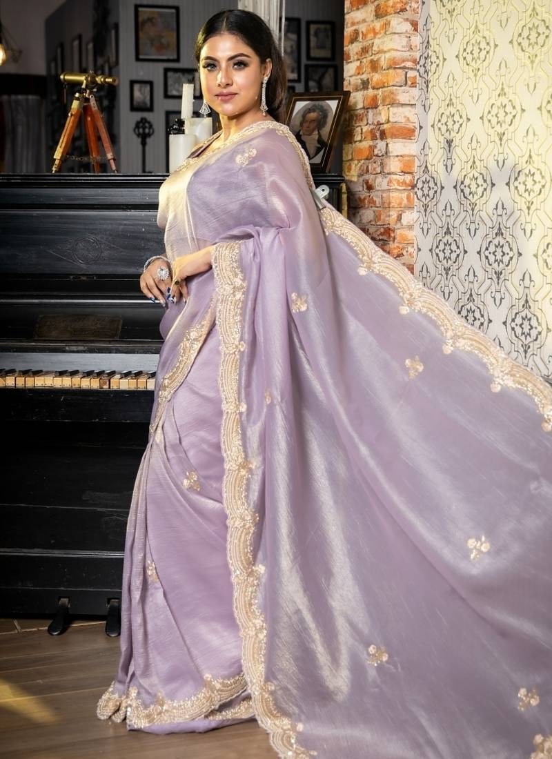 | Product Description | Delicate Yet Impactful, The Lavender & Gold Dual Tone Crushed Silk Tissue Fancy Saree Is A Blend Of Soft Shimmer & Ornate Handwork. The All Over Cut Dana, Sequins, Moti, Resham & Matte Copper Zardosi Handwork Glistens Over Textured Fabric Base, Creating A Stunning Play Of Light & Detail.