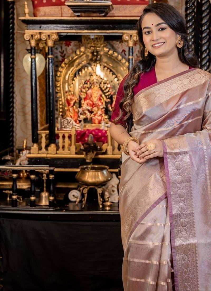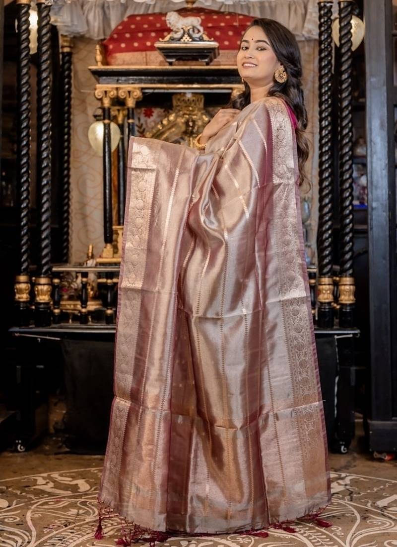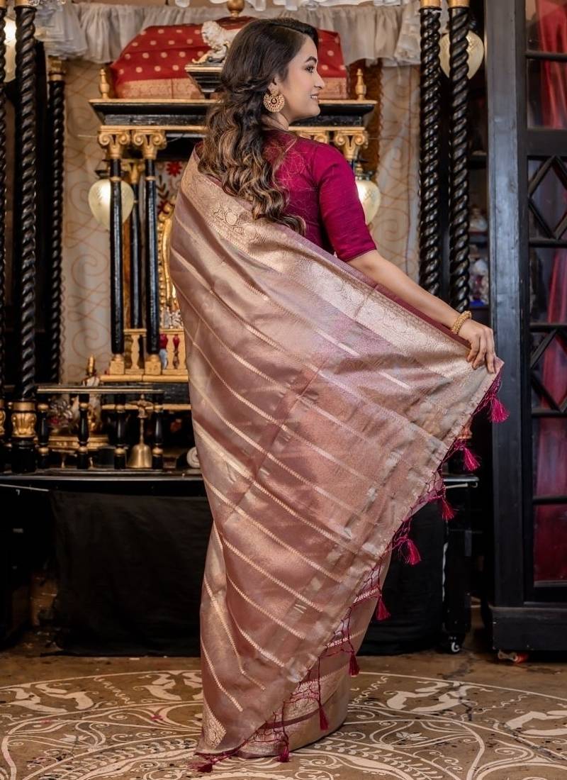 | Product Description | Graceful & Refined, This Onion Pink & Copper Brown Dual Tone Tissue Silk Banarasi Saree Marries Timeless Elegance With A Touch Of Modern Vibrance. Its All Over Matte Copper Zari Stripes Lend A Soft Luster, Bringing Poise To Every Drape.