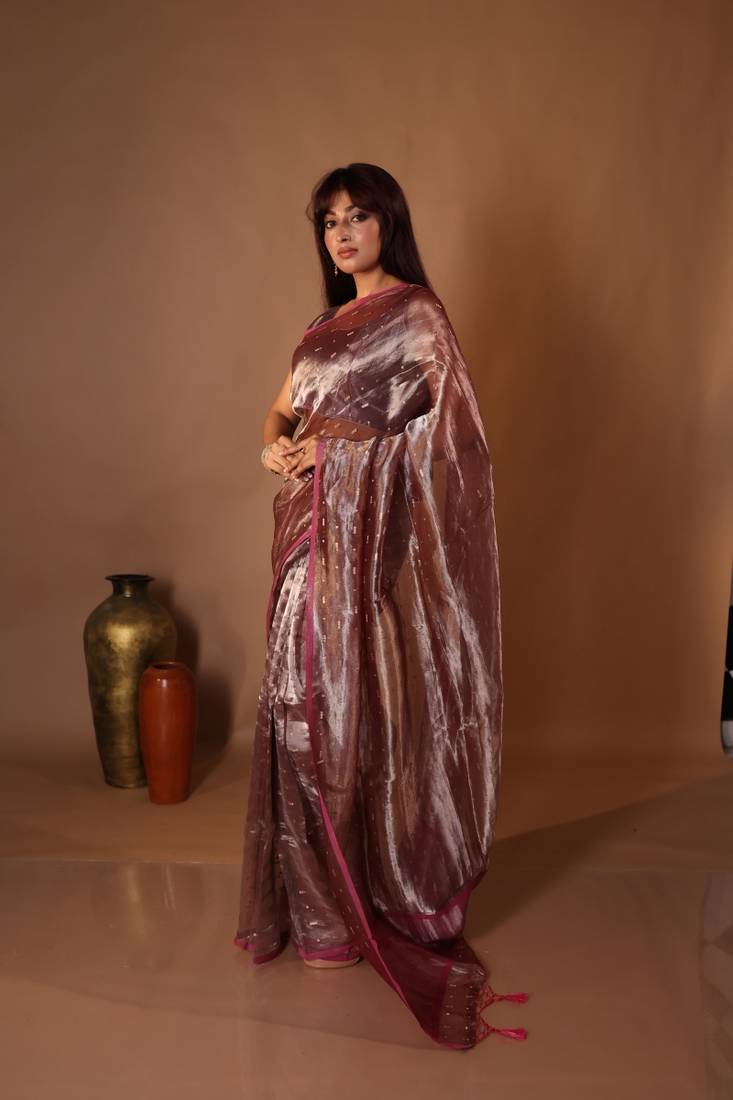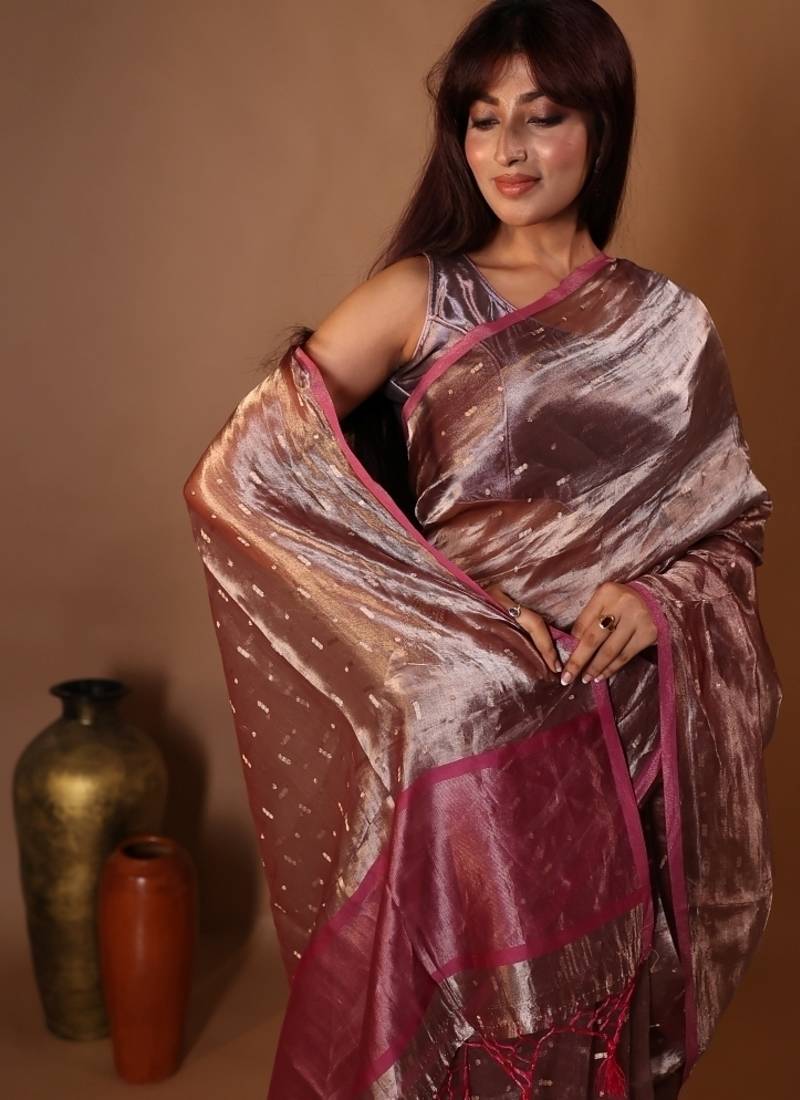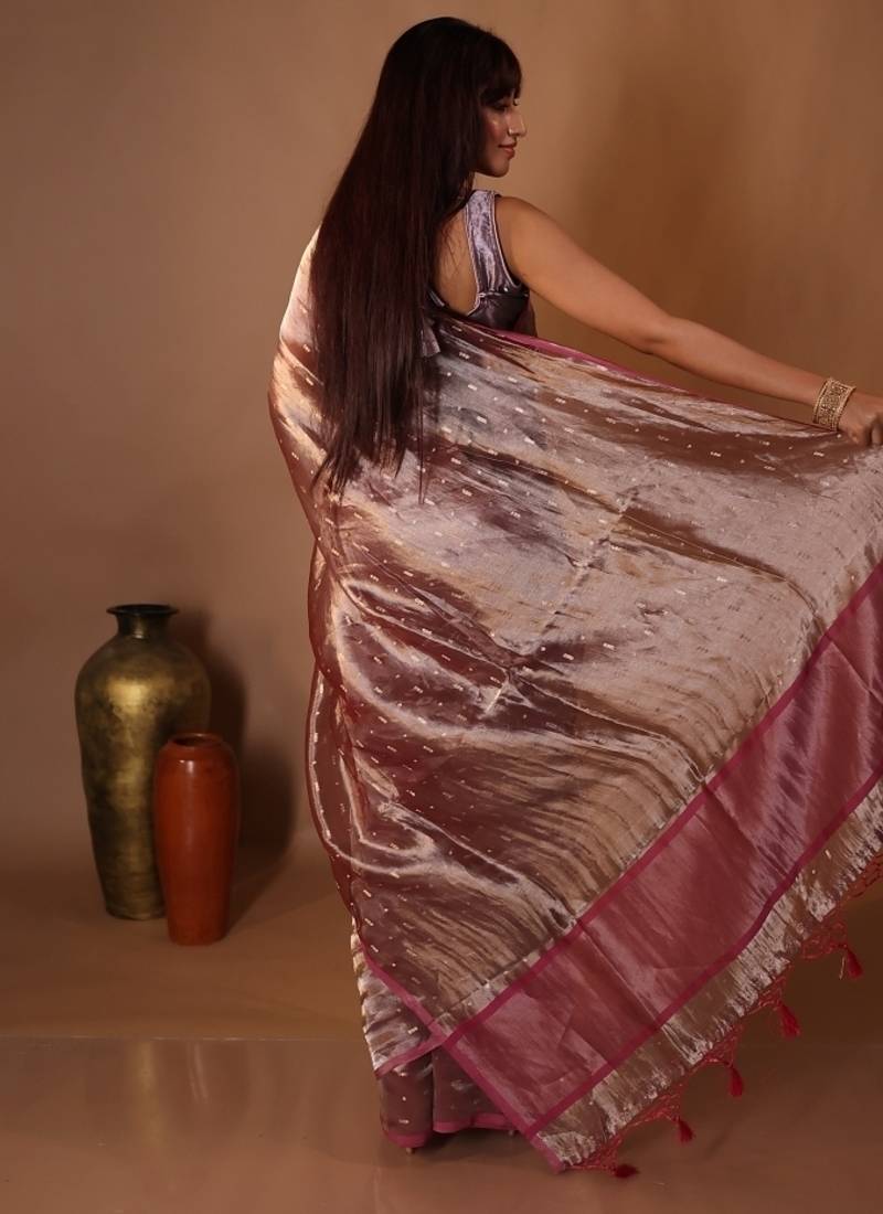 | Product Description | The Taupe Brown &Onion Pink Dual Tone Tissue Silk Banarasi Saree Captures The Essence Of Quiet Luxury. Its All Over Golden Zari Buti Work Sparkles Gently Against The Dual Tone Base, Creating Depth & Understated Glamour.