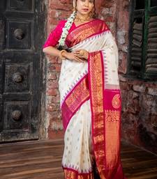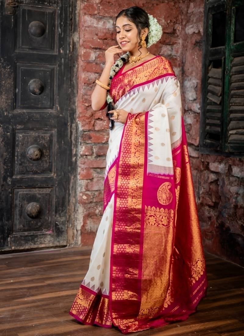 | Product Description | The Off White Pure Gadwal Silk Handloom Saree Is A Graceful Celebration Of South Indian Heritage. The Gadwal Silk Body Is Adorned With All Over Antique Gold Buti, Lending It A Soft Luminosity Against Off White Backdrop. The Saree Is Framed With A Magenta & Antique Gold Zari Border, While The Brocade Pallu Is Intricately Woven In Antique Gold Zari.