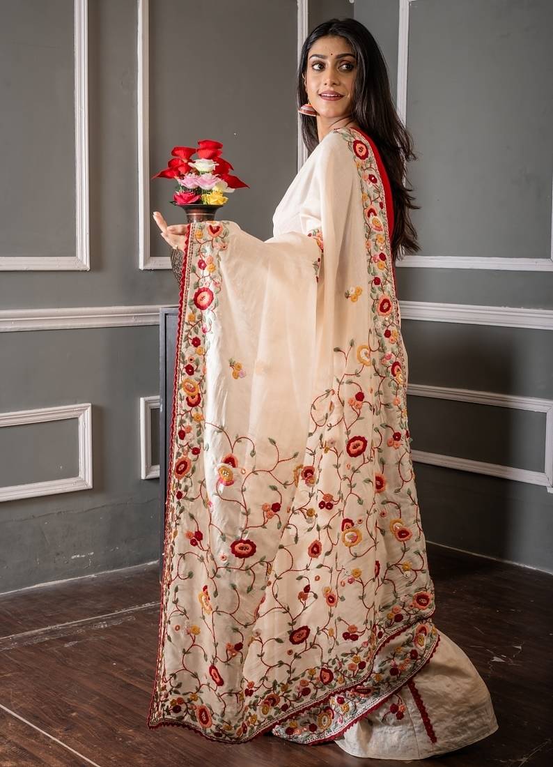 | Product Description | The Off White Pure Tussar Silk Saree Is A Timeless Canvas Of Delicate Craftsmanship & Heritage Embroidery. The Soft, Textured Tussar Silk Base Is Adorned With All Over Multi Colour Resham Parsi Gara Floral Motifs. Subtle Sequins Highlights Are Scattered Throughout, Adding A Gentle Shimmer That Enhances The Saree’s Graceful Allure.