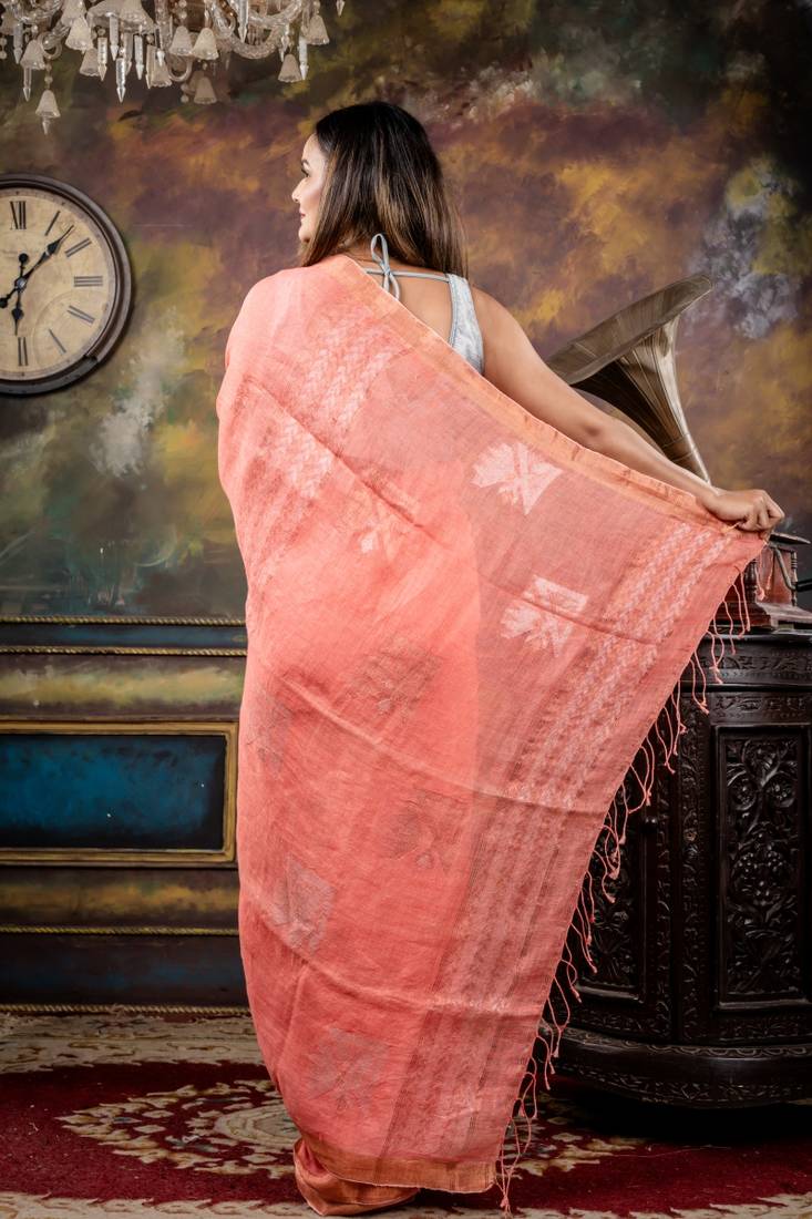 | Product Description | The Coral Pink Linen Bengal Handloom Saree Features All Over Silver & Copper Zari Abstract Jamdani Buta, A Striped Pallu, & A Sleek Copper Zari Border — A Harmonious Fusion Of Texture, Sheen, & Understated Elegance.