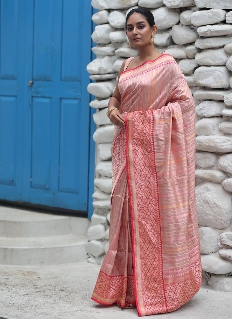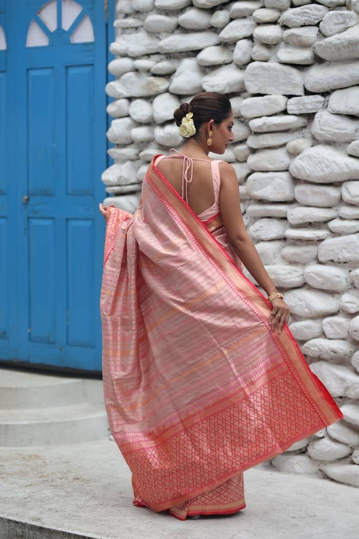 | Product Description | Delicate Yet Striking, The Pastel Pink Pure Katan Handloom Banarasi Saree Captures The Essence Of Quiet Luxury. Woven In Pure Katan Silk, It Features All Over Sona Rupa Zari Kadhua Stripe Detailing—An Elegant Interplay Of Gold & Silver Threads That Lends A Subtle Shimmer To Its Soft Pastel Base.
