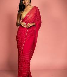 | Product Description | Bold & Captivating, This Saree Showcases A Deep Raspberry Pink Georgette Chiffon Saree With All Over Golden Cut Dana Handwork. It Is Beautifully Enhanced By Shimmering Golden Stripes That Cascade Throughout The Fabric, Creating An Exquisite Interplay Of Color & Light. The Golden Border Adds A Regal Touch, Making It An Ideal Pick For Festive Occasions & Celebrations.
