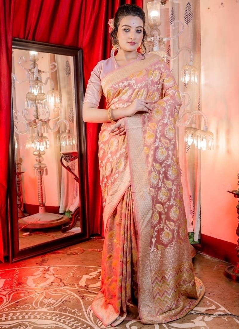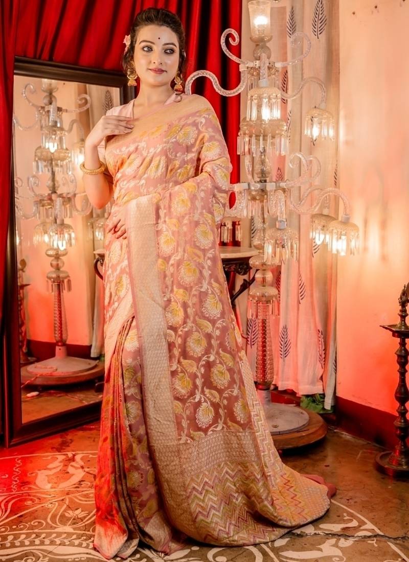 | Product Description | This Rose Taupe Khaddi Georgette Banarasi Saree Is A Blend Of Artistry & Elegance. Featuring Delicate Rifling Handbrush Multi Colour Accents Alongside Intricate Matte Gold Zari Floral Motifs & Jaal, This Saree Tells A Story Of Handcrafted Finesse & Timeless Beauty.