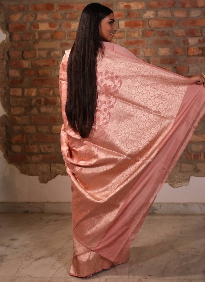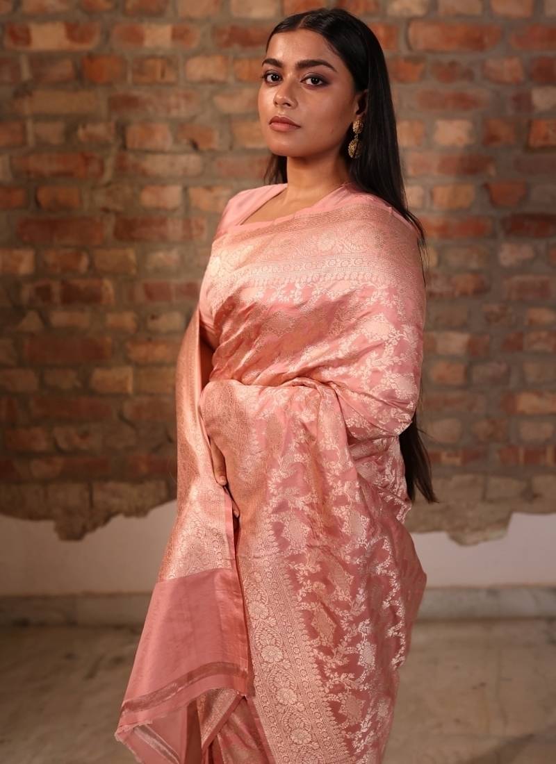 | Product Description | The Dusty Pink Pure Katan Banarasi Saree Is A Graceful Ode To Timeless Elegance. This Saree Is Adorned With An Intricate All Over Jaal Pattern, Woven In Matte Gold Zari, Which Subtly Catches The Light To Enhance The Pink Base With A Delicate Shimmer.