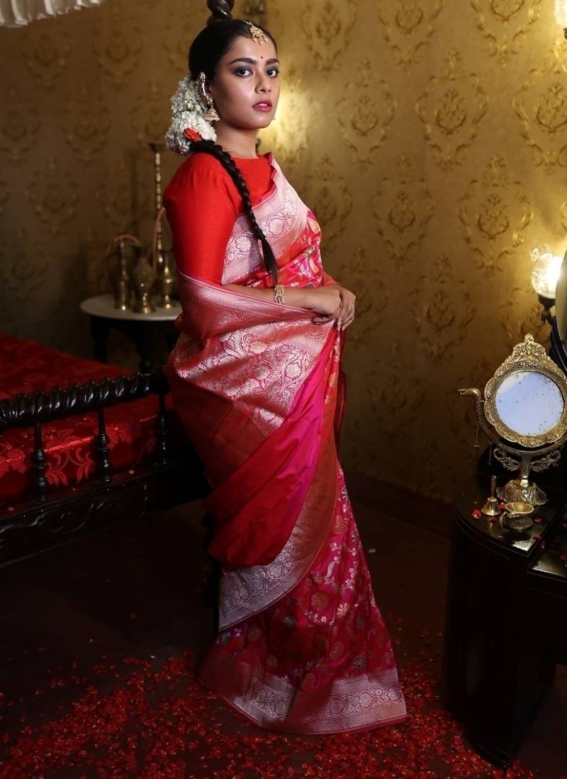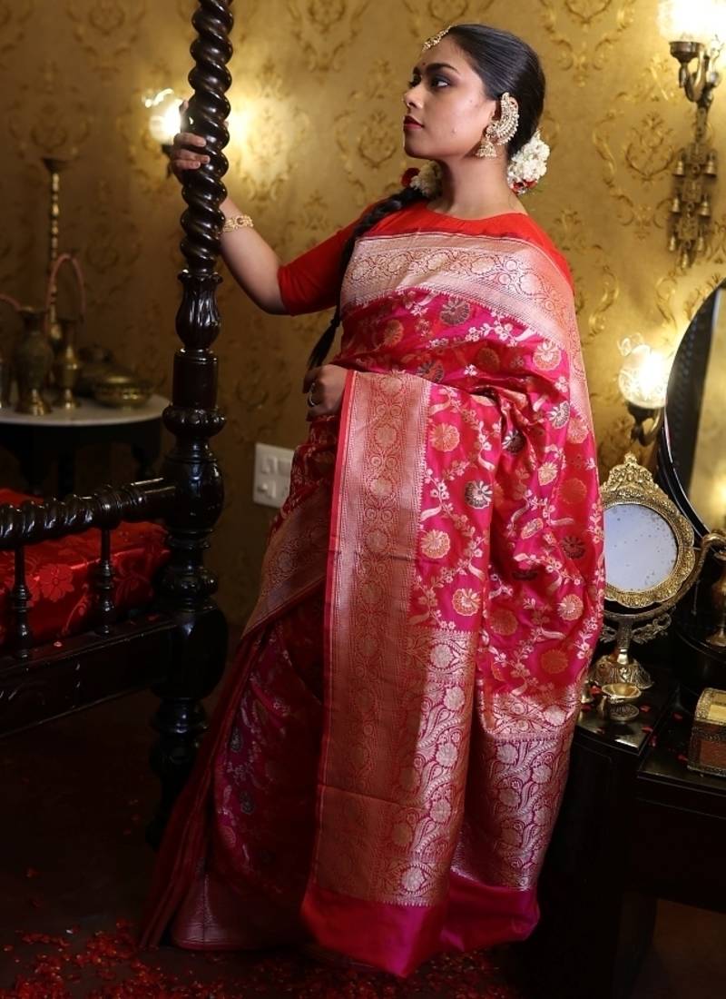 | Product Description | This Saree Brings Together Rich Tradition & Vibrant Detail In Harmony. Adorned With All Over Jangla Woven In Matte Gold Zari & Delicately Accented With Meenakari Highlights, The Rani Pink &Magenta Dual Tone Pure Katan Banarasi Saree Radiates Festive Grandeur
