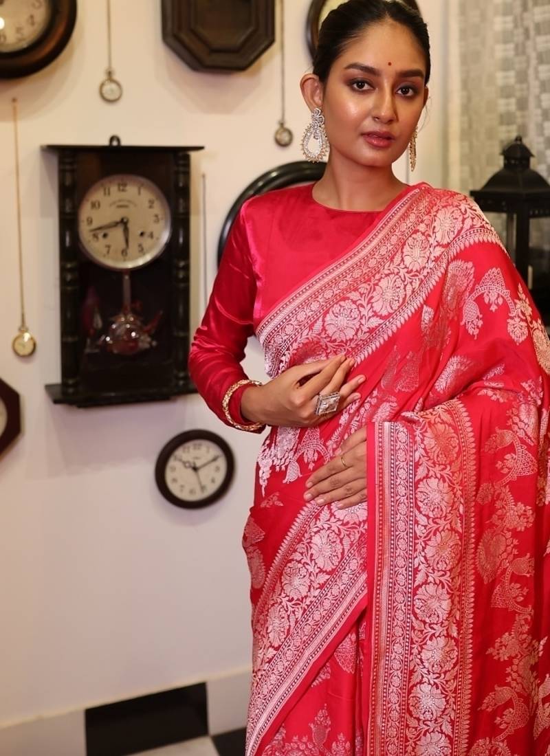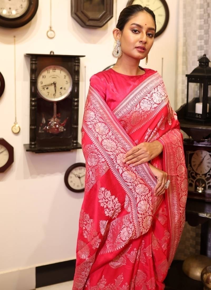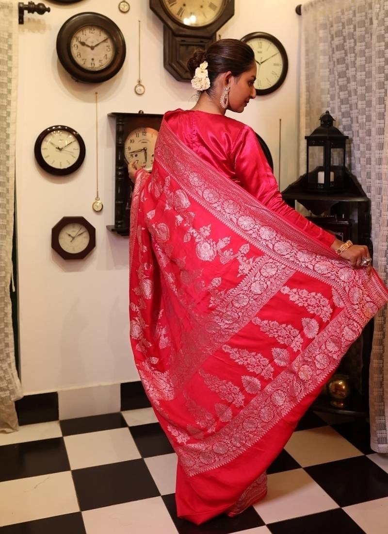 Bold Yet Elegant, This Saree Beautifully Blends Sheen, Structure, & Tradition. Featuring All Over Floral Jaal Intricately Woven In Silver Zari, The Magenta Pink Pure Mashru Banarasi Saree Radiates A Refined Opulence, Brought To Life Through Its Lustrous Texture & Vivid Colour.