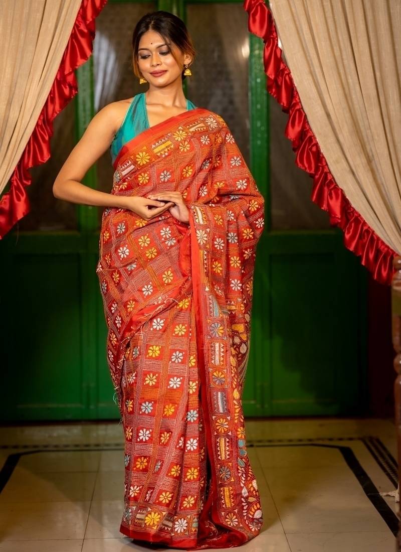Red woven faux silk blend blend kantha work all seasons sarees