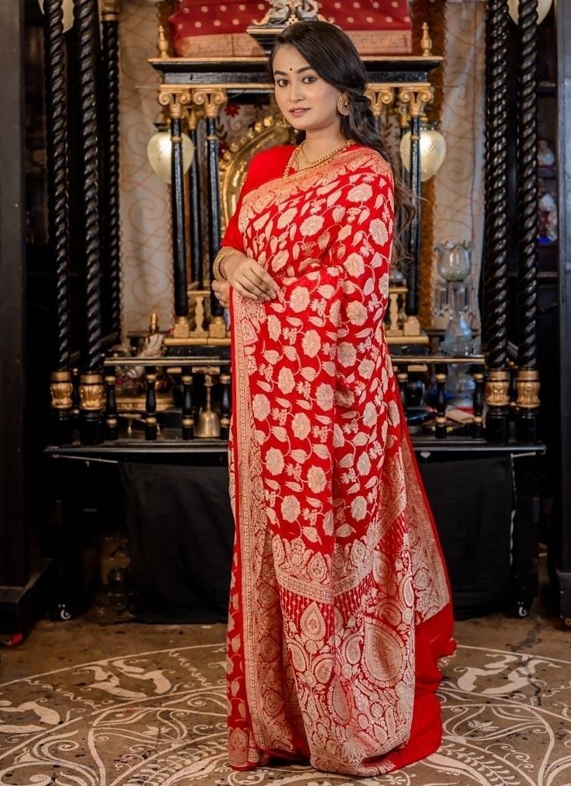 | Product Description | Fiery & Graceful, This Saree Brings Together Rich Colour & Timeless Craftsmanship. Featuring All Over Jangla Intricately Woven In Matte Gold Zari, The Vermillion Red Khaddi Georgette Banarasi Saree Exudes A Radiant Charm.