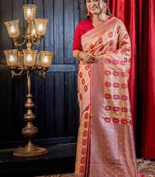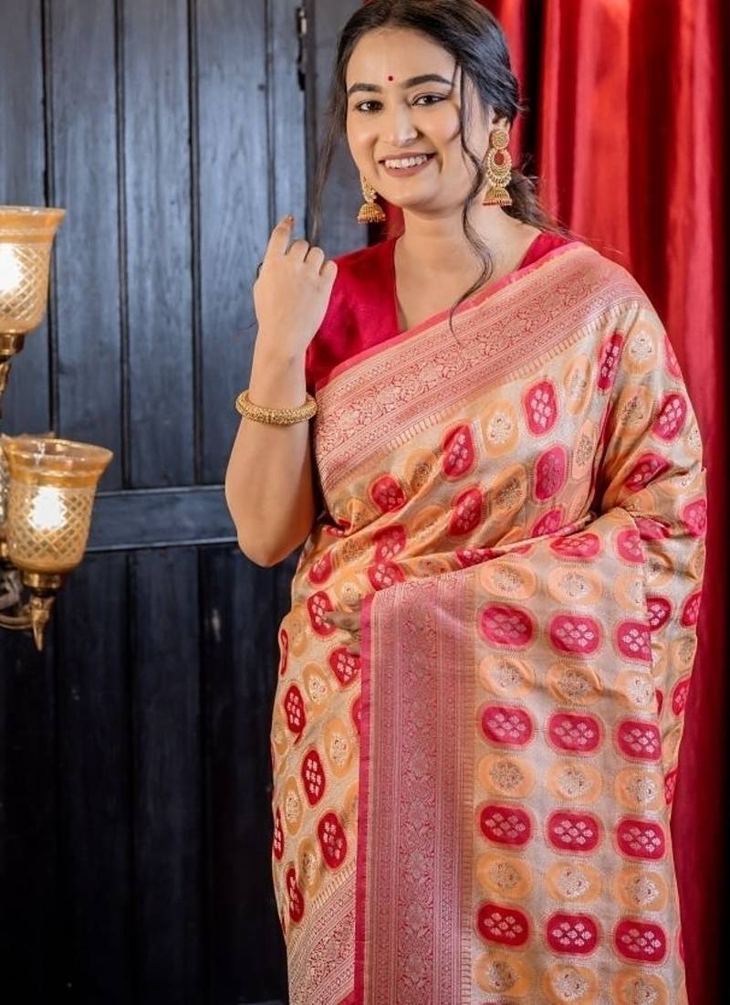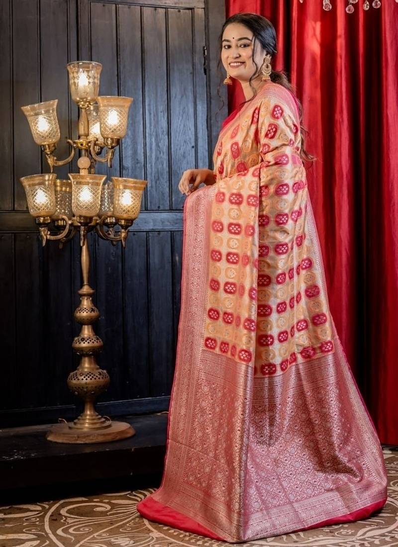 | Product Description | Tthe Woven Matte Gold Zari Base Matka Silk Banarasi Saree Redefines Tradition With A Bold Yet Refined Aesthetic. It Is Set Against A Matte Gold Zari Base, Creating Luminous Foundation For The Saree’s Striking All Over Capsule Shaped Buta In Shades Of Peach & Raspberry Red. Intricate Meenakari Floral Highlights Add A Layer Of Colorful Charm.