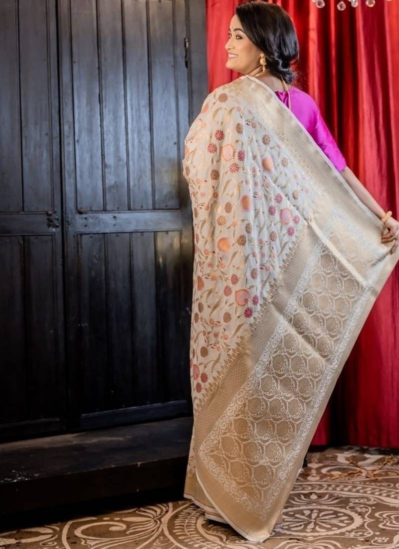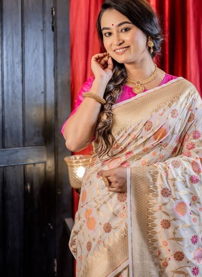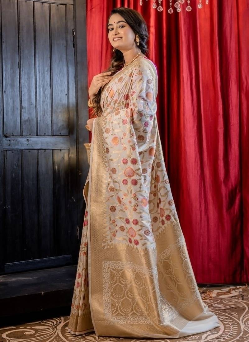 | Product Description | Ethereal & Intricately Woven, The Off White Soft Katan Banarasi Saree Is A Celebration Of Artistry & Grace. The Pristine Base Serves As A Canvas For An Exquisite All Over Multi Colour Floral Jamawar Design, Intricately Interlaced With Golden Zari Jaal. The Delicate Burst Of Colours Against The Soft Backdrop Evokes Vintage Charm While Keeping The Aesthetic Timeless & Refined.