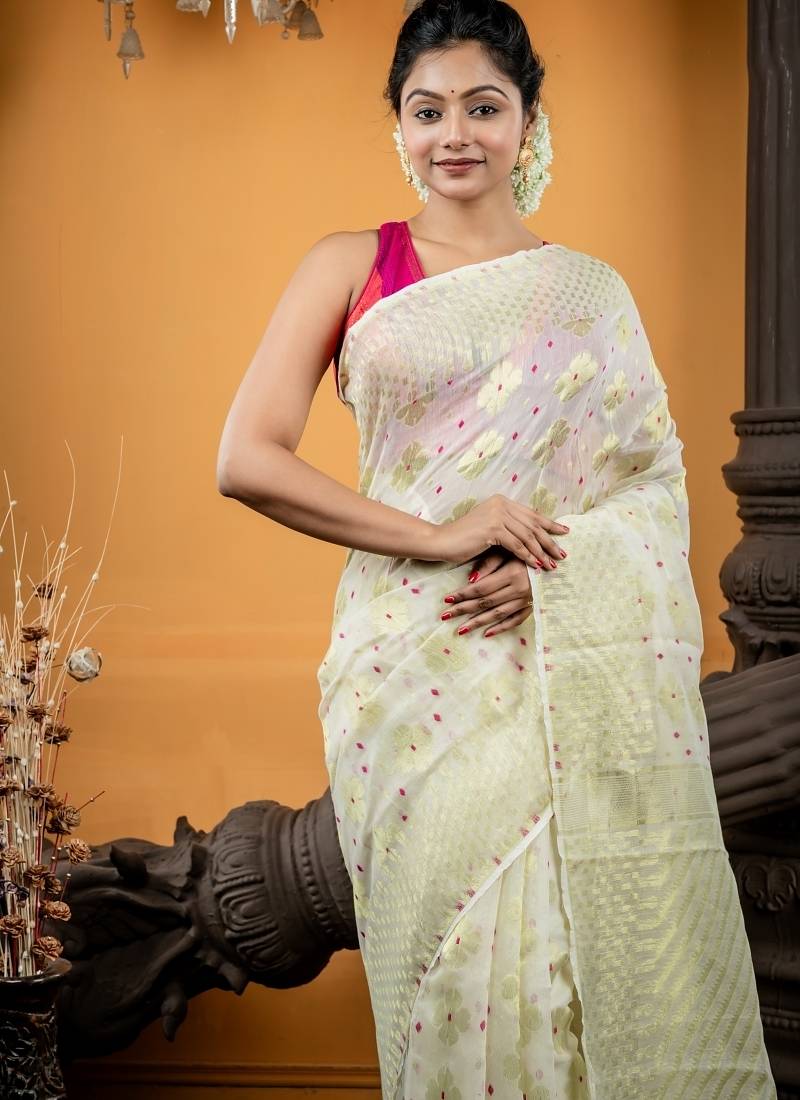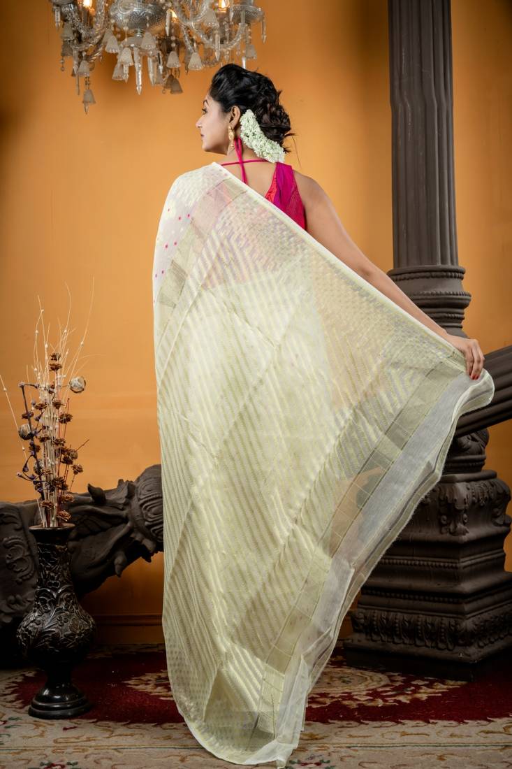 | Product Description | The Pearl White Resham Cotton Saree Features All Over Magenta Pink Dhakai Buti & Golden Zari Floral Jamdani Buta, Enhanced By A Structured Checkerbox Border & A Complementary Stripe Pallu For A Balanced, Graceful Finish.