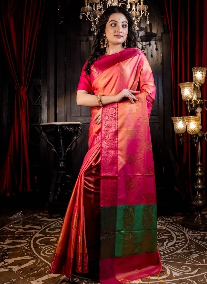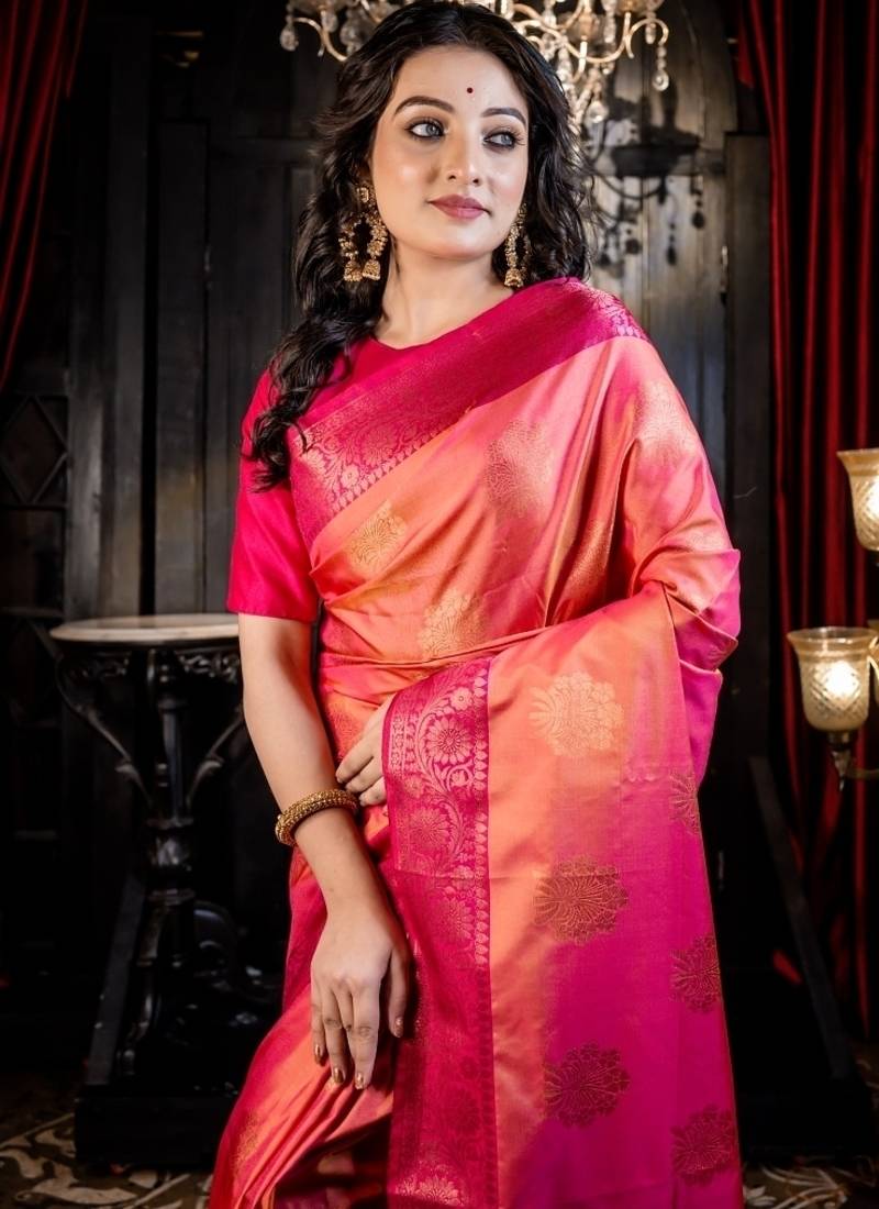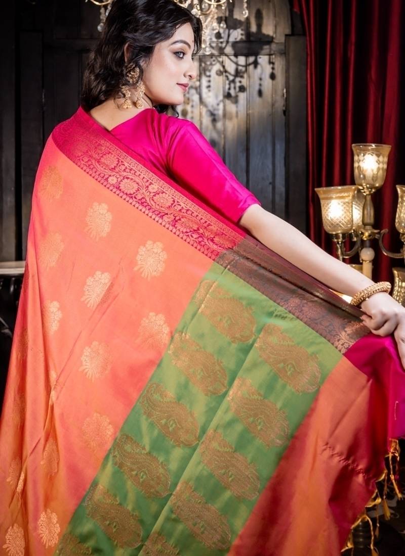 | Product Description | Radiant & Warm, This Saree Beautifully Combines Vibrant Hues With Intricate Detailing. Adorned With All Over Buta Motifs Woven In Copper Zari, The Dual Tone Blend Of Orange & Mustard Yellow Is Perfectly Complemented By A Striking Magenta Pink Floral Motif Zari Border, Adding Depth & Elegance To The Design.