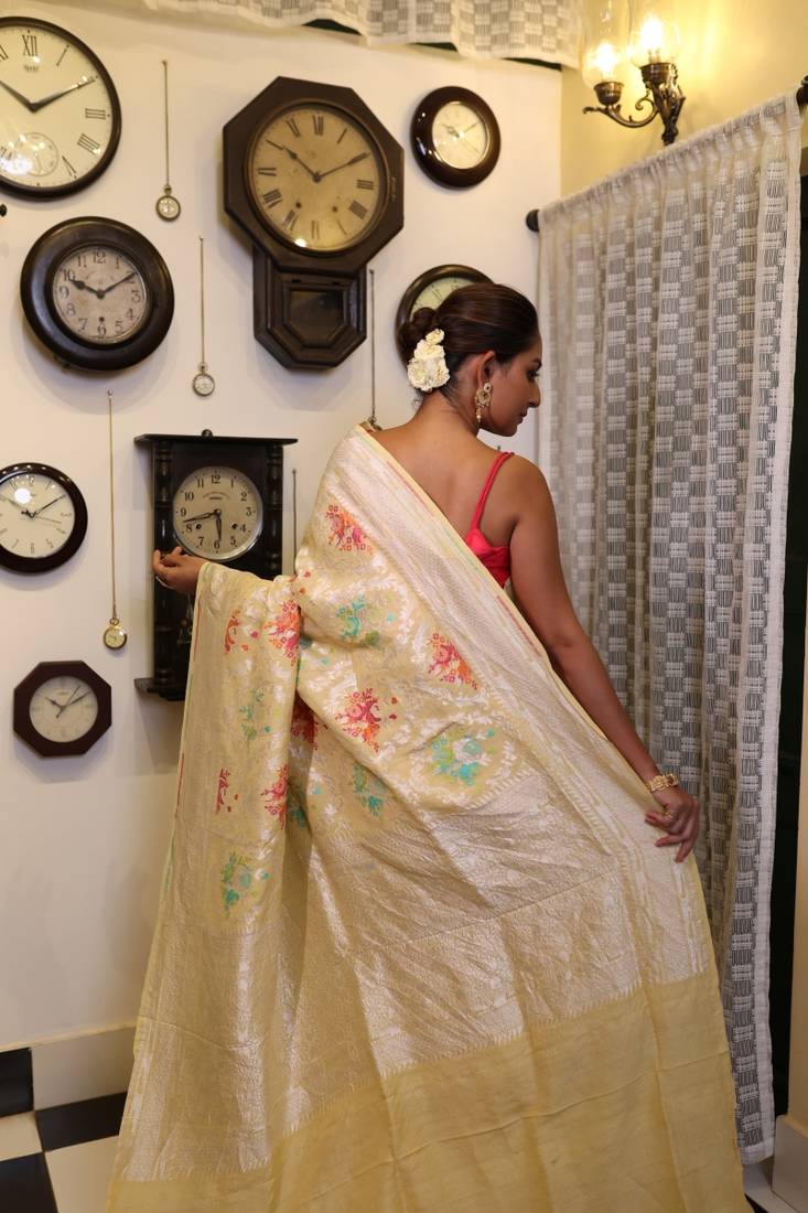 | Product Description | Softly Radiant & Artistically Vibrant, The Buttermilk Yellow Pure Tussar Georgette Banarasi Saree Is A Handloom Masterpiece That Celebrates Joyful Expression. Adorned With A Delicate Silver Zari Jaal & Playful Splashes Of Multi Colour Detailing, It Brings A Painterly Charm To The Grace Of Tradition.