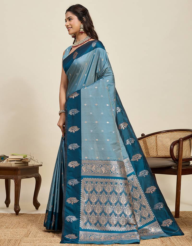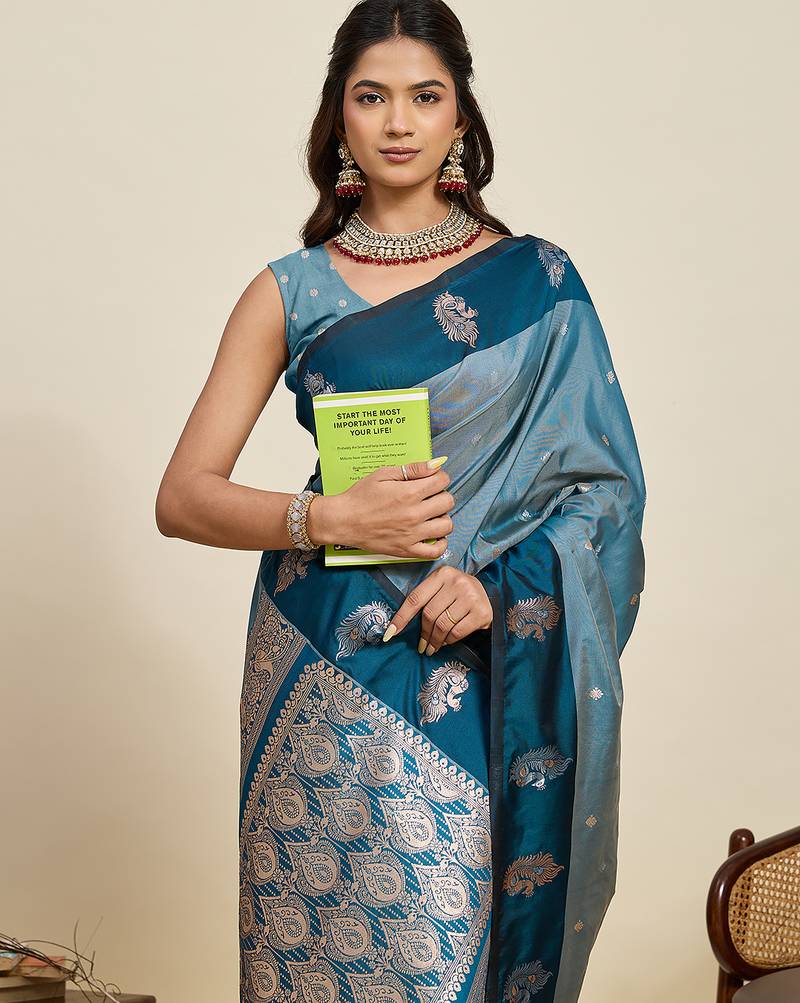 Teal banarasi zari work soft art silk saree for wedding and functions