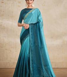Ocean blue satin silk heavy embroidered saree with unstitched blouse piece