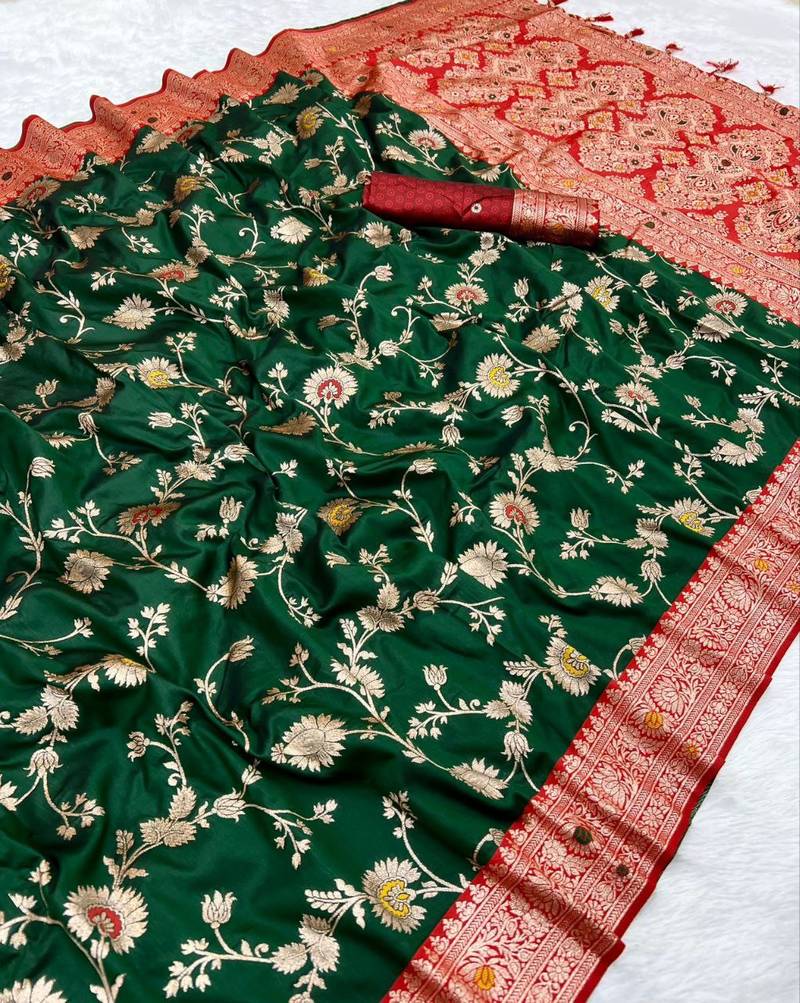 | Product Name | Green Soft Silk Blend Saree With Zari Weaving Meenakari Design | |