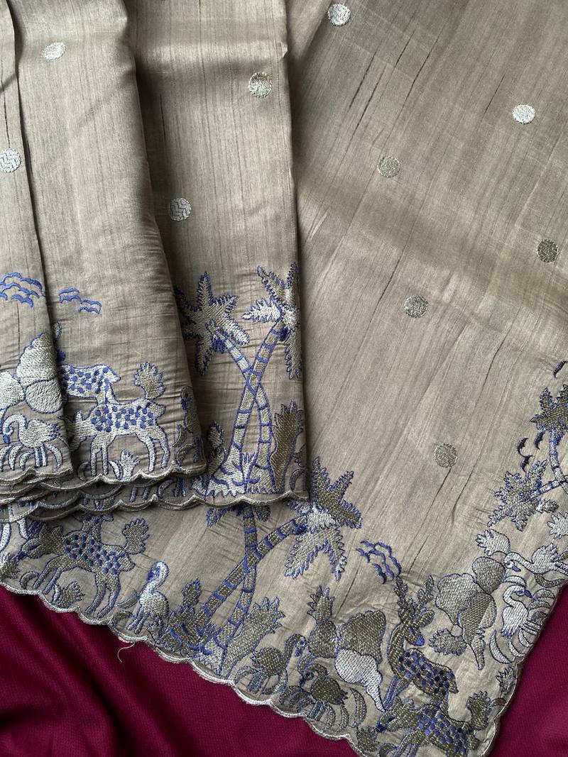 Grey matka silk saree with heavy floral embroidery border with running blouse