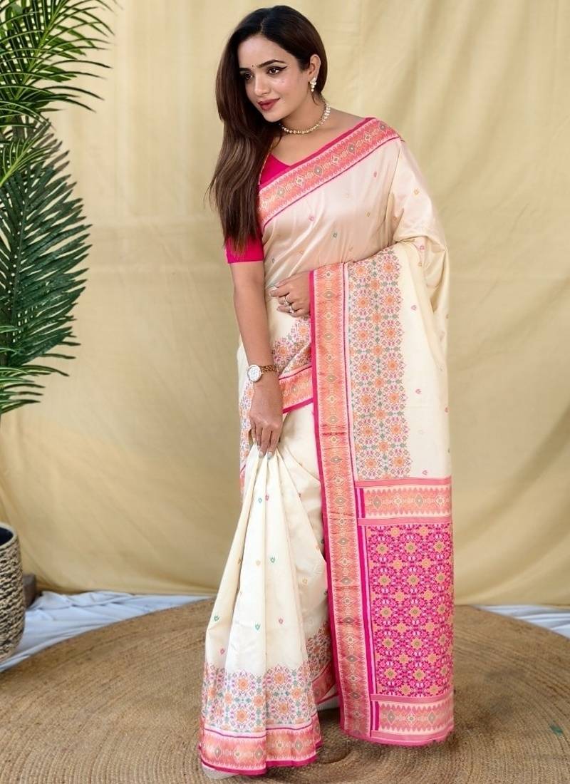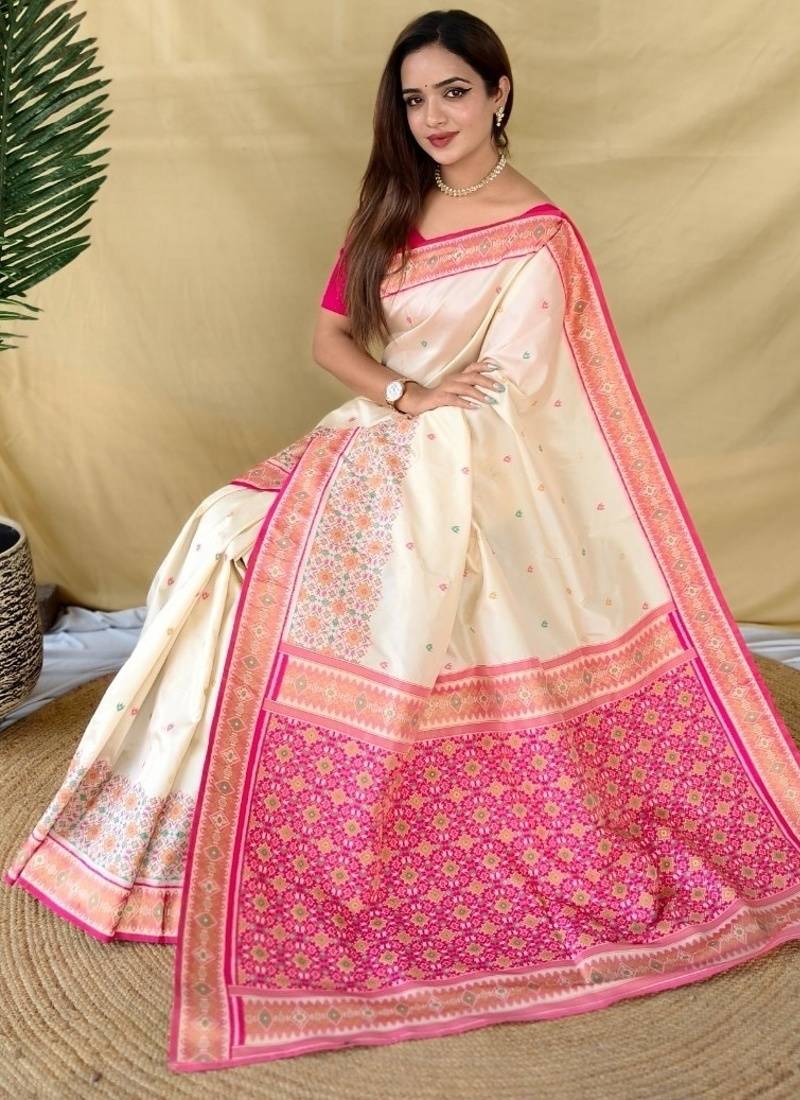Ivory soft silk saree with multithread zari contrast patola border and pallu