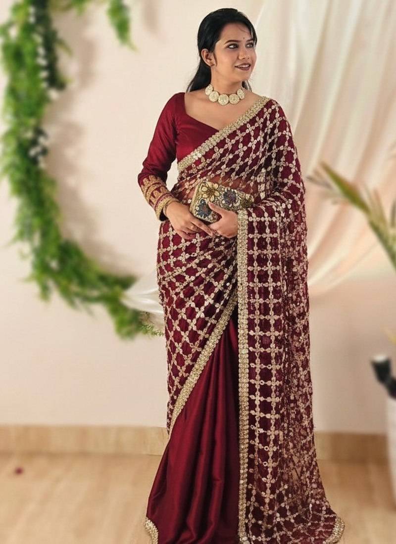 Maroon pure soft fandy sattin silk with real mirror work lace border saree